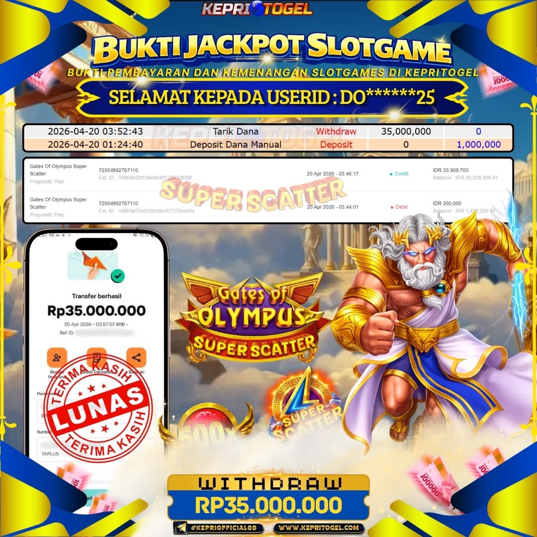 Selamat kepada UserId DO******25 telah berhasil mendapatkan kemenangan jackpot pada permainan Slot Gates Of Olympus Super Scatter Kepritogel sebesar Rp35,000,000- . Kepritogel situs terpercaya sejak dulu hingga saat ini , Untuk kemenangan berapapun pasti akan kami bayarkan . Jangan ragu bermain di Kepri Togel . Kami pihak Kepritogel Menyampaikan terima kasih kepada seluruh member Kepri Togel yang telah Percaya dan setia Bersama kami bermain di Kepritogel hingga saat ini.