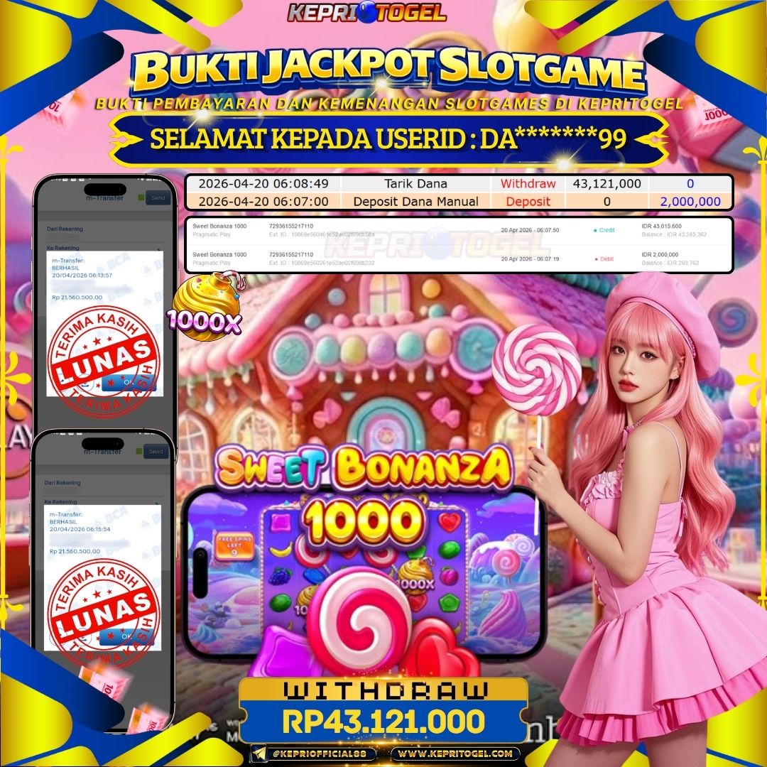 Selamat kepada UserId DA*******99 telah berhasil mendapatkan kemenangan jackpot pada permainan Slot Sweet Bonanza 1000 Kepritogel sebesar Rp43,121,000- . Kepritogel situs terpercaya sejak dulu hingga saat ini , Untuk kemenangan berapapun pasti akan kami bayarkan . Jangan ragu bermain di Kepri Togel . Kami pihak Kepritogel Menyampaikan terima kasih kepada seluruh member Kepri Togel yang telah Percaya dan setia Bersama kami bermain di Kepritogel hingga saat ini.