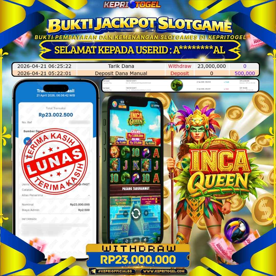 Selamat kepada UserId A********AL telah berhasil mendapatkan kemenangan jackpot pada permainan Slot Inca Queen Kepritogel sebesar Rp23,000,000- . Kepritogel situs terpercaya sejak dulu hingga saat ini , Untuk kemenangan berapapun pasti akan kami bayarkan . Jangan ragu bermain di Kepri Togel . Kami pihak Kepritogel Menyampaikan terima kasih kepada seluruh member Kepri Togel yang telah Percaya dan setia Bersama kami bermain di Kepritogel hingga saat ini.