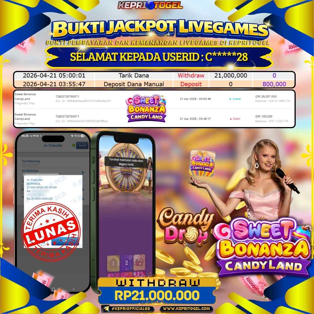 Selamat kepada UserId C*****28 telah berhasil mendapatkan kemenangan jackpot pada permainan Live Game Sweet Bonanza Candyland Kepritogel sebesar Rp21,000,000,- . Kepritogel situs terpercaya sejak dulu hingga saat ini , Untuk kemenangan berapapun pasti akan kami bayarkan . Jangan ragu bermain di Kepri Togel . Kami pihak Kepritogel Menyampaikan terima kasih kepada seluruh member Kepri Togel yang telah Percaya dan setia Bersama kami bermain di Kepritogel hingga saat ini.