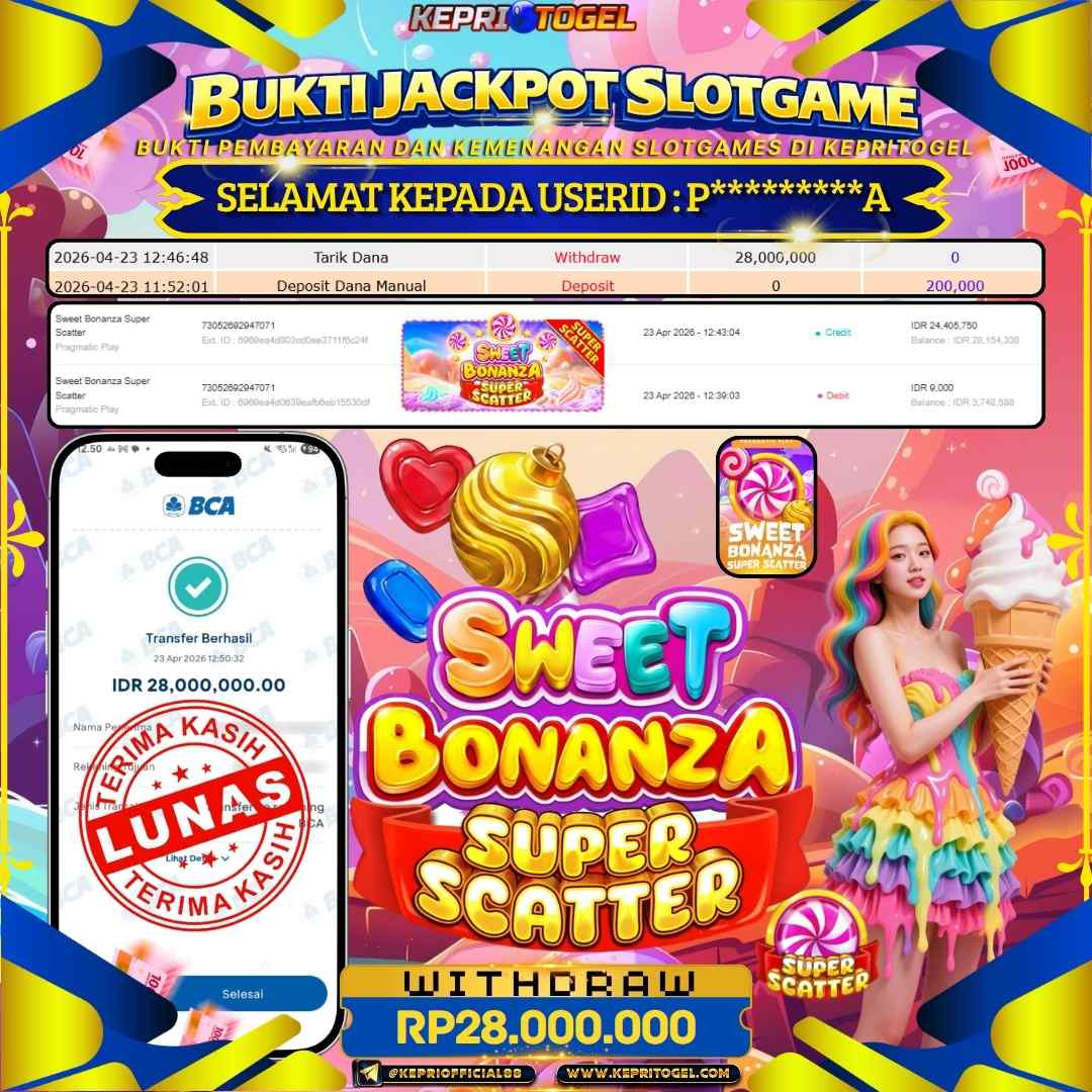 Selamat kepada UserId P*********A telah berhasil mendapatkan kemenangan jackpot pada permainan Slot Sweet Bonanza Super Scatter Kepritogel sebesarRp28,000,000- . Kepritogel situs terpercaya sejak dulu hingga saat ini , Untuk kemenangan berapapun pasti akan kami bayarkan . Jangan ragu bermain di Kepri Togel . Kami pihak Kepritogel Menyampaikan terima kasih kepada seluruh member Kepri Togel yang telah Percaya dan setia Bersama kami bermain di Kepritogel hingga saat ini.