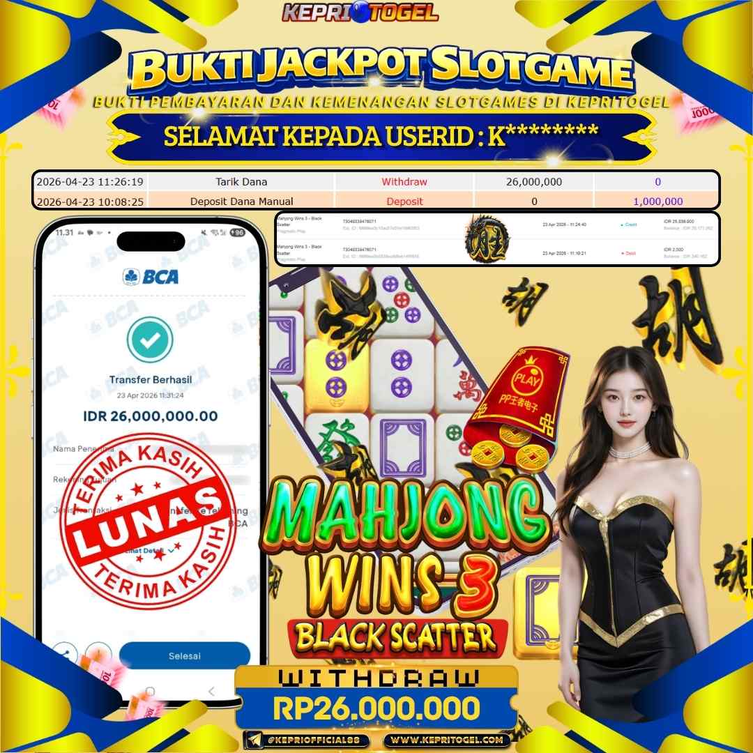 Selamat kepada UserId K******** telah berhasil mendapatkan kemenangan jackpot pada permainan Slot Mahjong Wins 3 - Black Scatter Kepritogel sebesar Rp26,000,000- . Kepritogel situs terpercaya sejak dulu hingga saat ini , Untuk kemenangan berapapun pasti akan kami bayarkan . Jangan ragu bermain di Kepri Togel . Kami pihak Kepritogel Menyampaikan terima kasih kepada seluruh member Kepri Togel yang telah Percaya dan setia Bersama kami bermain di Kepritogel hingga saat ini