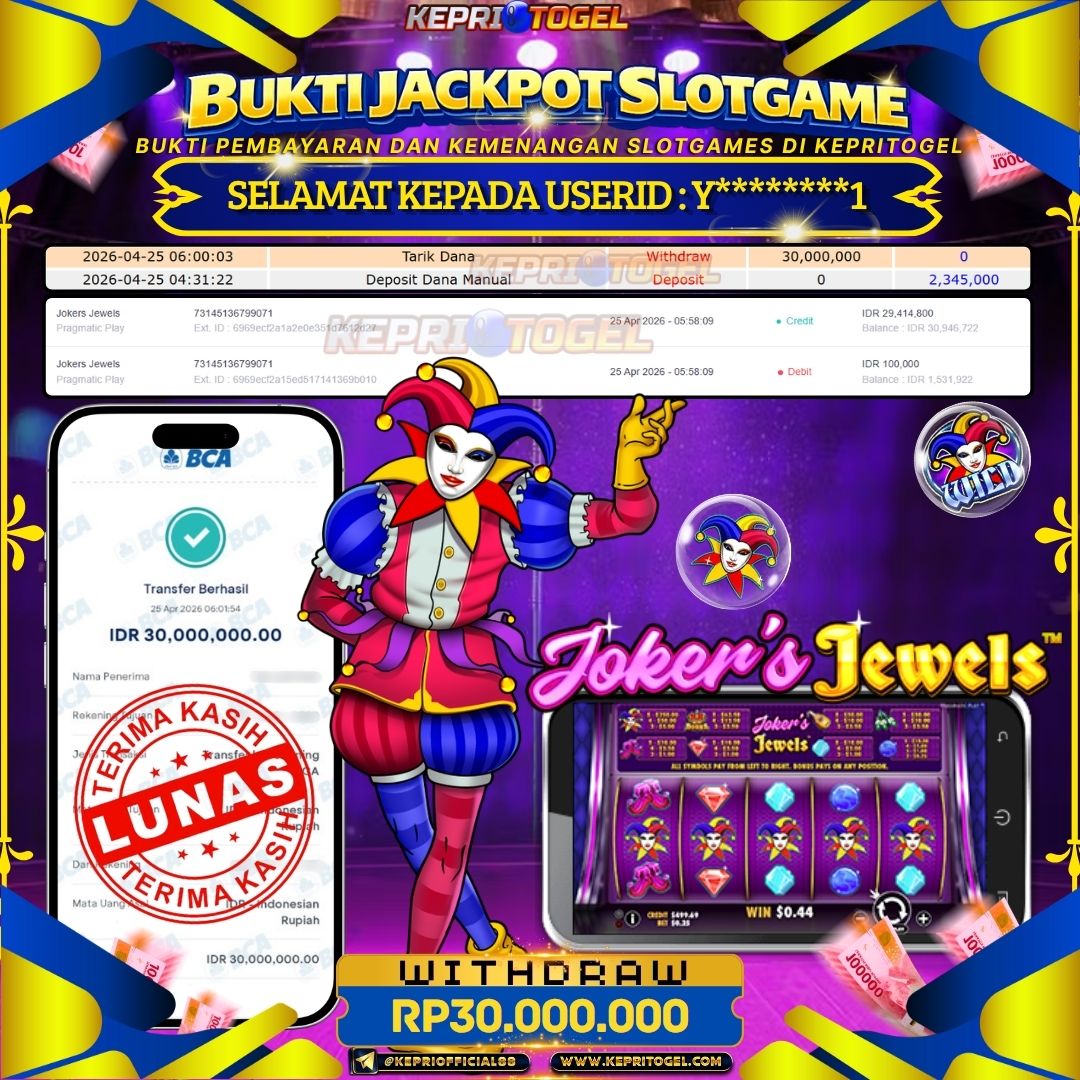 Selamat kepada UserId Y********1 telah berhasil mendapatkan kemenangan jackpot pada permainan Slot Jokers Jewels Kepritogel sebesar Rp30,000,000- . Kepritogel situs terpercaya sejak dulu hingga saat ini , Untuk kemenangan berapapun pasti akan kami bayarkan . Jangan ragu bermain di Kepri Togel . Kami pihak Kepritogel Menyampaikan terima kasih kepada seluruh member Kepri Togel yang telah Percaya dan setia Bersama kami bermain di Kepritogel hingga saat ini.