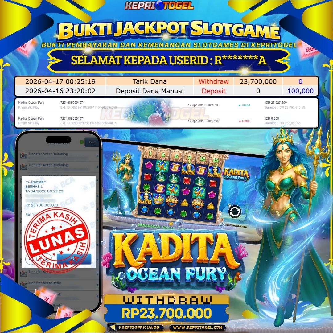 Selamat kepada UserId R*******A telah berhasil mendapatkan kemenangan jackpot pada permainan Slot Kadita Ocean Fury Kepritogel sebesar Rp23,700,000- . Kepritogel situs terpercaya sejak dulu hingga saat ini , Untuk kemenangan berapapun pasti akan kami bayarkan . Jangan ragu bermain di Kepri Togel . Kami pihak Kepritogel Menyampaikan terima kasih kepada seluruh member Kepri Togel yang telah Percaya dan setia Bersama kami bermain di Kepritogel hingga saat ini.