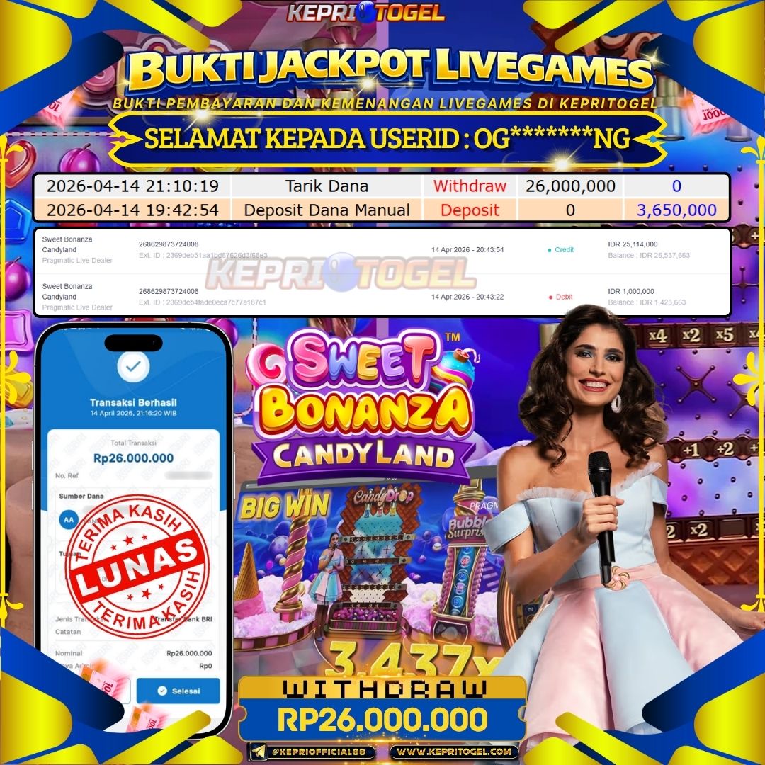 Selamat kepada UserId OG*******NG telah berhasil mendapatkan kemenangan jackpot pada permainan Live Game Sweet Bonanza Candyland Kepritogel sebesar Rp26,000,000,- . Kepritogel situs terpercaya sejak dulu hingga saat ini , Untuk kemenangan berapapun pasti akan kami bayarkan . Jangan ragu bermain di Kepri Togel . Kami pihak Kepritogel Menyampaikan terima kasih kepada seluruh member Kepri Togel yang telah Percaya dan setia Bersama kami bermain di Kepritogel hingga saat ini.
