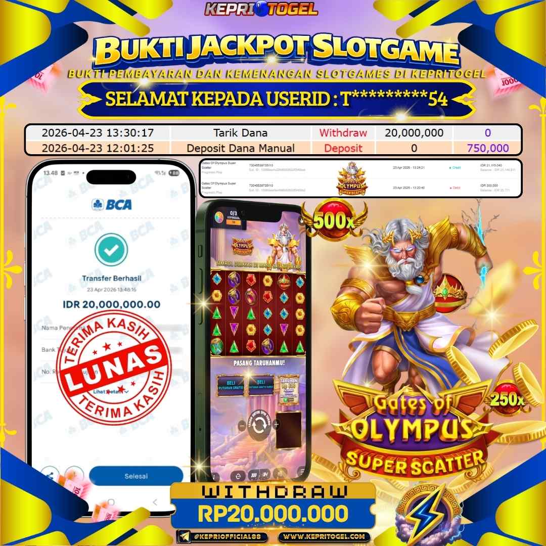 Selamat kepada UserId T*********54 telah berhasil mendapatkan kemenangan jackpot pada permainan Slot Gates Of Olympus Super Scatter Kepritogel sebesar Rp20,000,000- . Kepritogel situs terpercaya sejak dulu hingga saat ini , Untuk kemenangan berapapun pasti akan kami bayarkan . Jangan ragu bermain di Kepri Togel . Kami pihak Kepritogel Menyampaikan terima kasih kepada seluruh member Kepri Togel yang telah Percaya dan setia Bersama kami bermain di Kepritogel hingga saat ini.