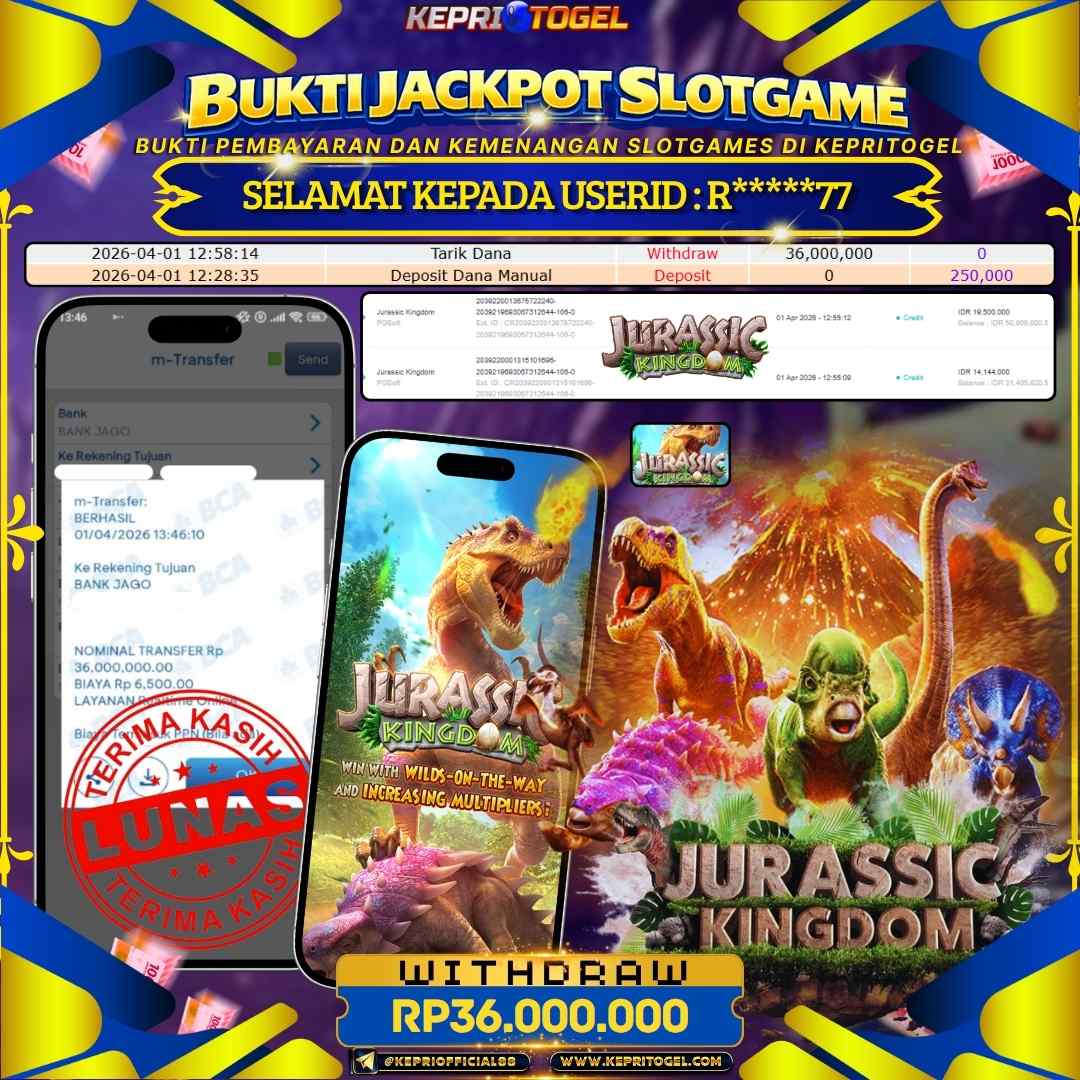 Kepritogel Jackpot Slot Jurassic Kingdom Rp36,000,000