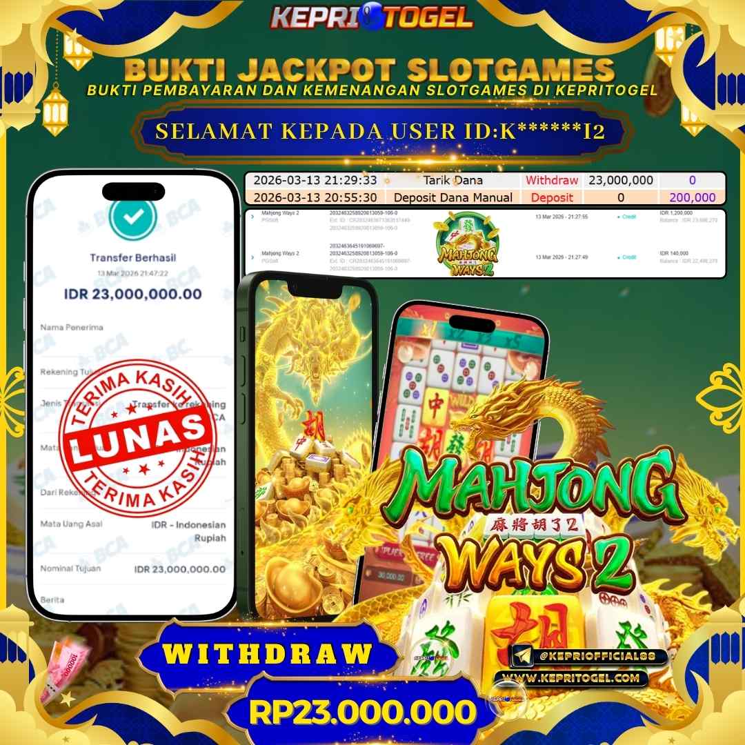 Selamat kepada UserId K******I2 telah berhasil mendapatkan kemenangan jackpot pada permainan slot Mahjong Ways 2 Kepritogel sebesar Rp23,000,000,- . Kepritogel situs terpercaya sejak dulu hingga saat ini , Untuk kemenangan berapapun pasti akan kami bayarkan . Jangan ragu bermain di Kepri Togel . Kami pihak Kepritogel Menyampaikan terima kasih kepada seluruh member Kepri Togel yang telah Percaya dan setia Bersama kami bermain di Kepritogel hingga saat ini.