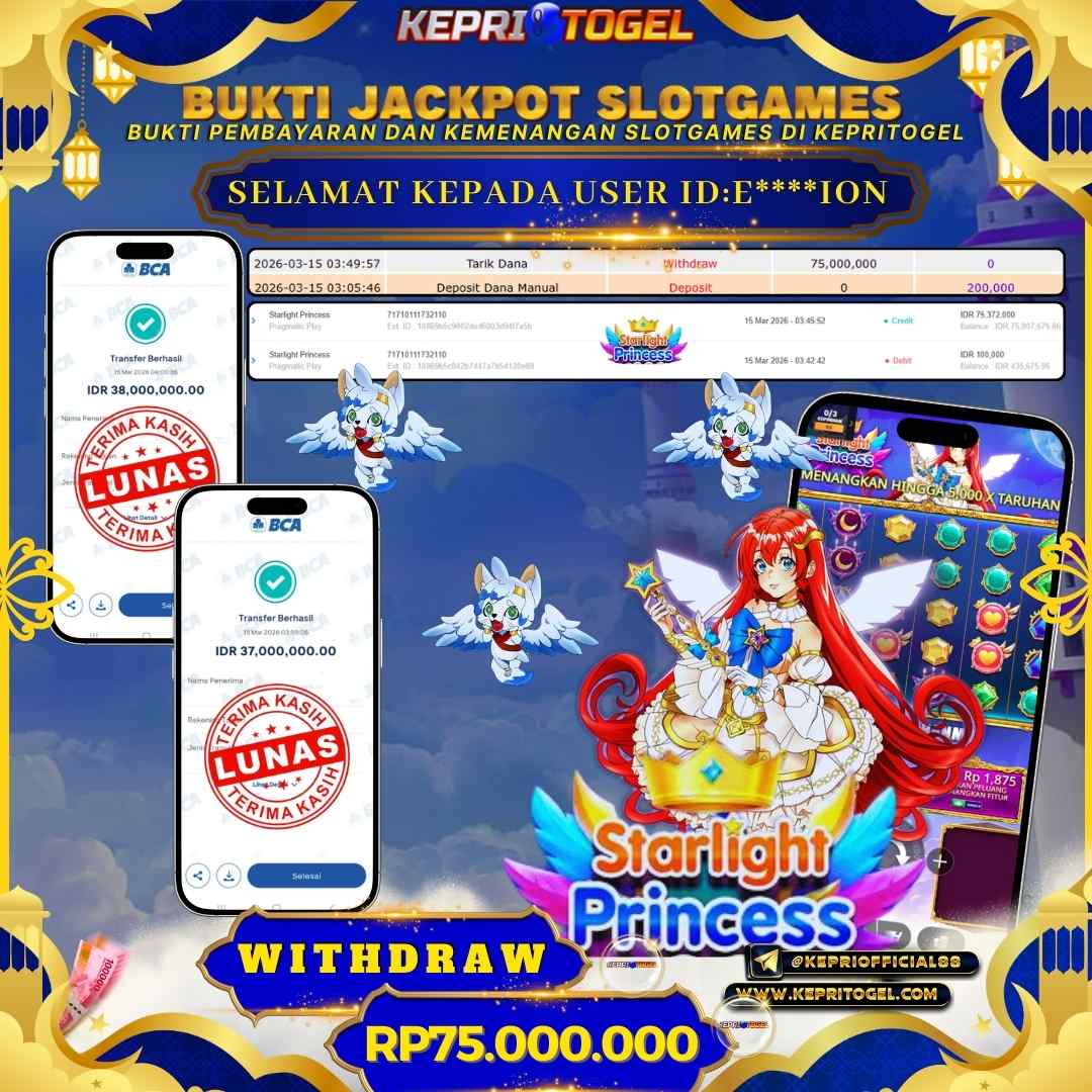 Selamat kepada UserId E****ION telah berhasil mendapatkan kemenangan jackpot pada permainan Slot Starlight Princess Kepritogel sebesar Rp75,000,000,- . Kepritogel situs terpercaya sejak dulu hingga saat ini , Untuk kemenangan berapapun pasti akan kami bayarkan . Jangan ragu bermain di Kepri Togel . Kami pihak Kepritogel Menyampaikan terima kasih kepada seluruh member Kepri Togel yang telah Percaya dan setia Bersama kami bermain di Kepritogel hingga saat ini.
