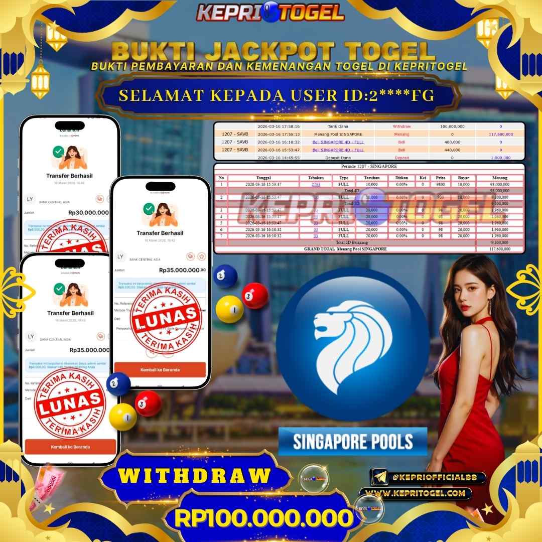 Selamat kepada UserId 2****FG telah berhasil mendapatkan kemenangan jackpot pada Togel Singapore Pools Kepritogel sebesar Rp100,000,000,- . Kepritogel situs terpercaya sejak dulu hingga saat ini , Untuk kemenangan berapapun pasti akan kami bayarkan . Jangan ragu bermain di Kepri Togel . Kami pihak Kepritogel Menyampaikan terima kasih kepada seluruh member Kepri Togel yang telah Percaya dan setia Bersama kami bermain di Kepritogel hingga saat ini.