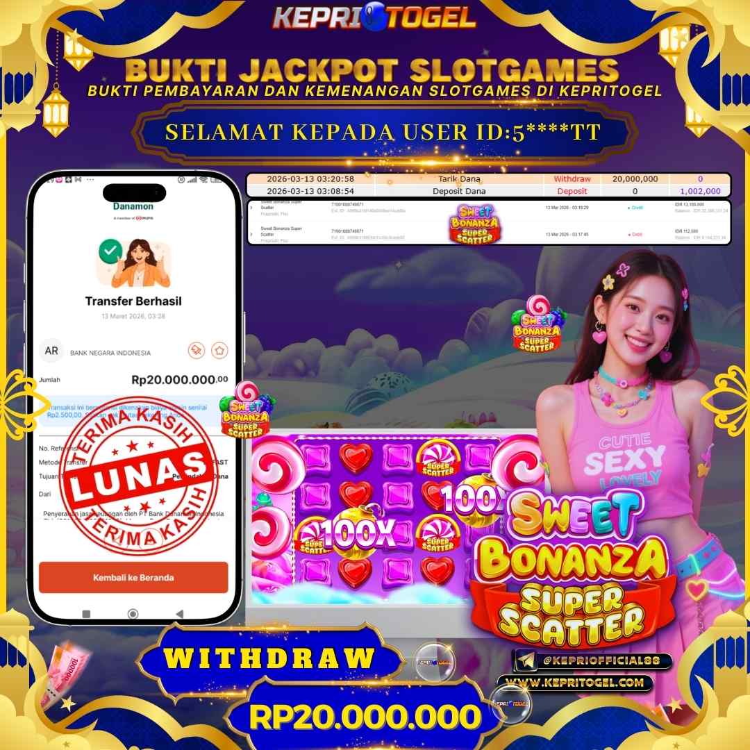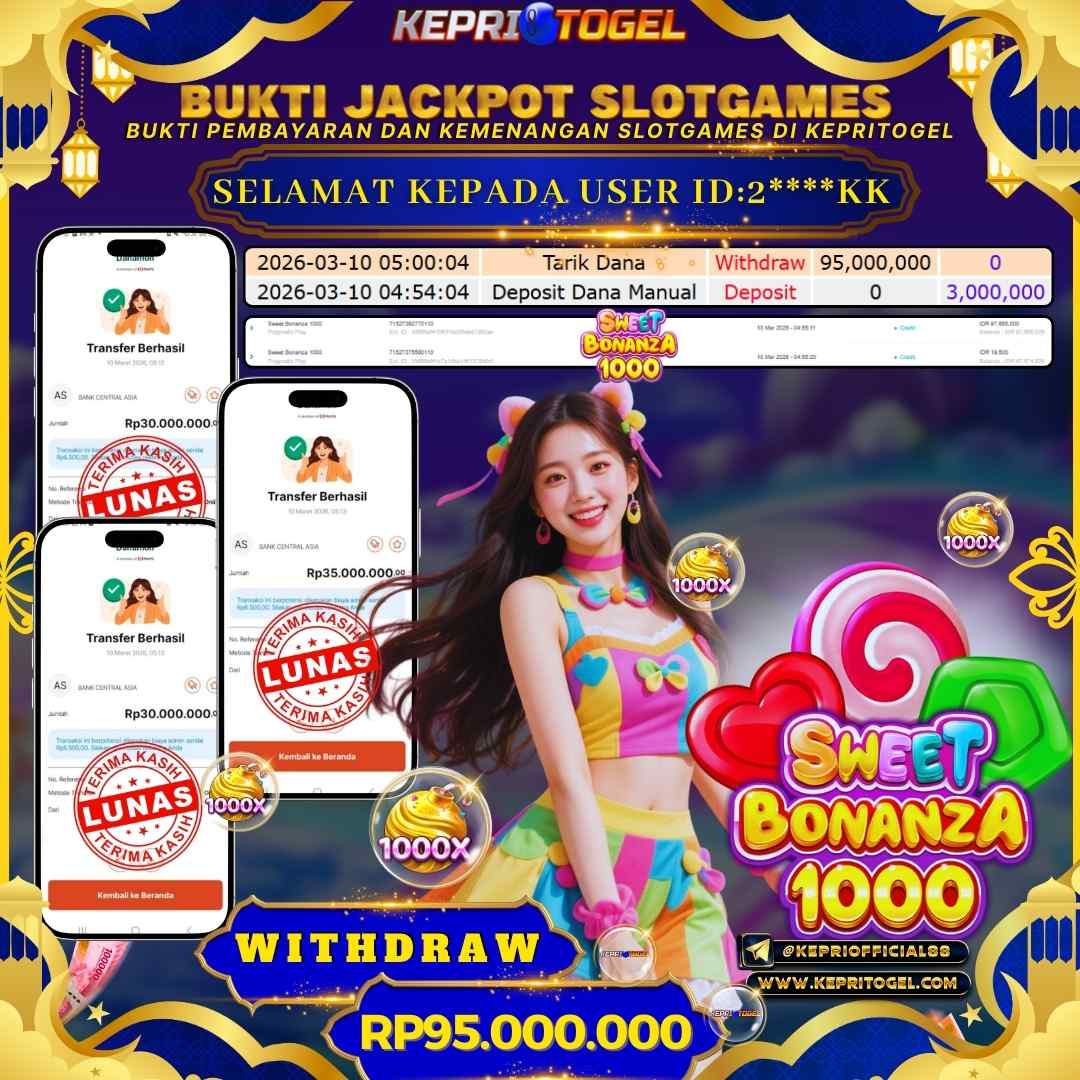 Selamat kepada UserId 2****KK telah berhasil mendapatkan kemenangan jackpot pada permainan Slot Sweet Bonanza 1000 Kepritogel sebesar Rp95,000,000,- . Kepritogel situs terpercaya sejak dulu hingga saat ini , Untuk kemenangan berapapun pasti akan kami bayarkan . Jangan ragu bermain di Kepri Togel . Kami pihak Kepritogel Menyampaikan terima kasih kepada seluruh member Kepri Togel yang telah Percaya dan setia Bersama kami bermain di Kepritogel hingga saat ini.