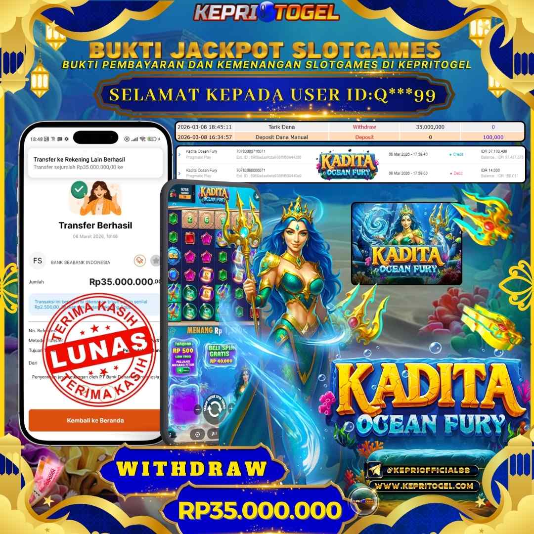 Selamat kepada UserId Q***99 telah berhasil mendapatkan kemenangan jackpot pada permainan Slot Kadita Ocean Fury Kepritogel sebesar Rp35,000,000,- . Kepritogel situs terpercaya sejak dulu hingga saat ini , Untuk kemenangan berapapun pasti akan kami bayarkan . Jangan ragu bermain di Kepri Togel . Kami pihak Kepritogel Menyampaikan terima kasih kepada seluruh member Kepri Togel yang telah Percaya dan setia Bersama kami bermain di Kepritogel hingga saat ini.