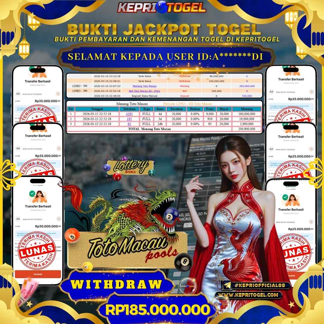 Selamat kepada UserId A*******DI telah berhasil mendapatkan kemenangan jackpot pada Togel Toto Macau 4D Kepritogel sebesar Rp185,000,000,- . Kepritogel situs terpercaya sejak dulu hingga saat ini , Untuk kemenangan berapapun pasti akan kami bayarkan . Jangan ragu bermain di Kepri Togel . Kami pihak Kepritogel Menyampaikan terima kasih kepada seluruh member Kepri Togel yang telah Percaya dan setia Bersama kami bermain di Kepritogel hingga saat ini.