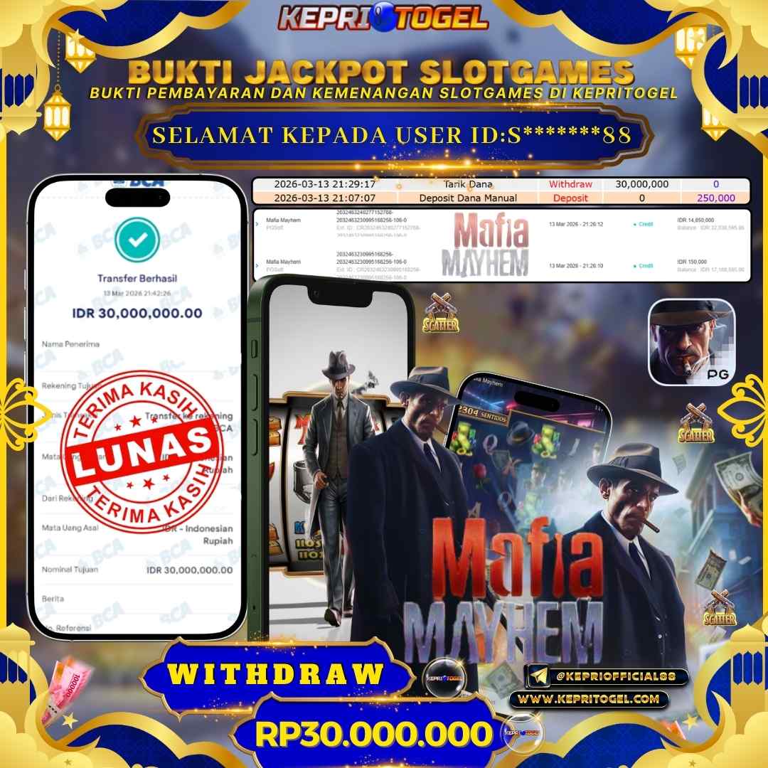 Selamat kepada UserId S*******88 telah berhasil mendapatkan kemenangan jackpot pada permainan Slot Mafia Mayhem Kepritogel sebesar Rp30,000,000,- . Kepritogel situs terpercaya sejak dulu hingga saat ini , Untuk kemenangan berapapun pasti akan kami bayarkan . Jangan ragu bermain di Kepri Togel . Kami pihak Kepritogel Menyampaikan terima kasih kepada seluruh member Kepri Togel yang telah Percaya dan setia Bersama kami bermain di Kepritogel hingga saat ini.