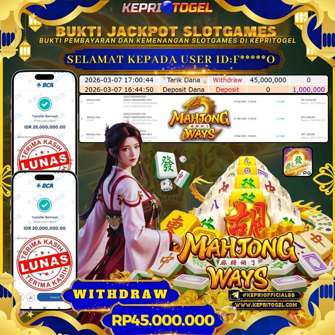 Selamat kepada UserId F*****O telah berhasil mendapatkan kemenangan jackpot pada permainan Slot Mahjong Ways Kepritogel sebesar Rp45,000,000,- . Kepritogel situs terpercaya sejak dulu hingga saat ini , Untuk kemenangan berapapun pasti akan kami bayarkan . Jangan ragu bermain di Kepri Togel . Kami pihak Kepritogel Menyampaikan terima kasih kepada seluruh member Kepri Togel yang telah Percaya dan setia Bersama kami bermain di Kepritogel hingga saat ini.