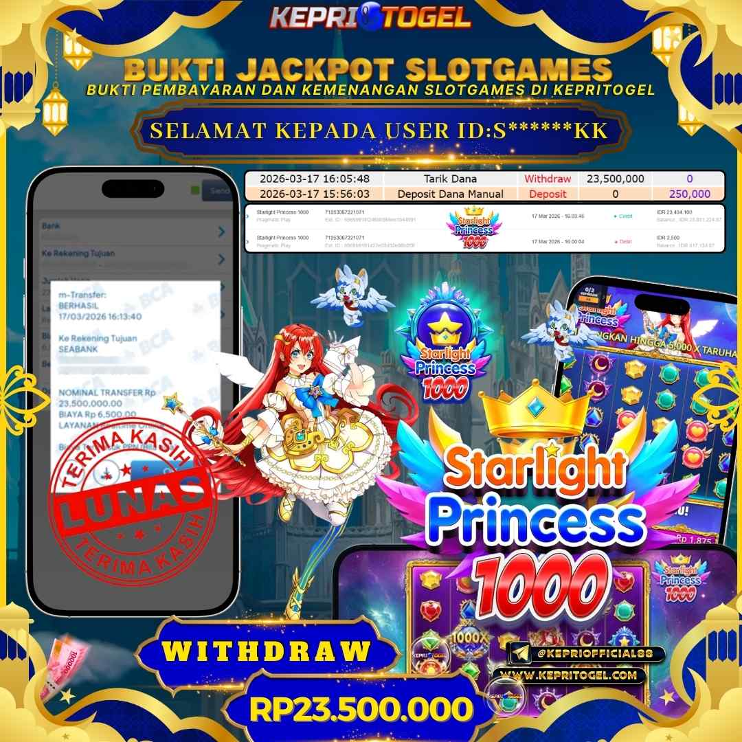 Selamat kepada UserId S******KK telah berhasil mendapatkan kemenangan jackpot pada permainan Slot Starlight Princess 1000 Kepritogel sebesar Rp23,500,000,- . Kepritogel situs terpercaya sejak dulu hingga saat ini , Untuk kemenangan berapapun pasti akan kami bayarkan . Jangan ragu bermain di Kepri Togel . Kami pihak Kepritogel Menyampaikan terima kasih kepada seluruh member Kepri Togel yang telah Percaya dan setia Bersama kami bermain di Kepritogel hingga saat ini.