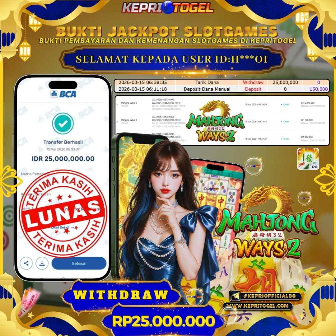 Selamat kepada UserId H***OI telah berhasil mendapatkan kemenangan jackpot pada permainan slot Mahjong Ways 2 Kepritogel sebesar Rp25,000,000,- . Kepritogel situs terpercaya sejak dulu hingga saat ini , Untuk kemenangan berapapun pasti akan kami bayarkan . Jangan ragu bermain di Kepri Togel . Kami pihak Kepritogel Menyampaikan terima kasih kepada seluruh member Kepri Togel yang telah Percaya dan setia Bersama kami bermain di Kepritogel hingga saat ini.