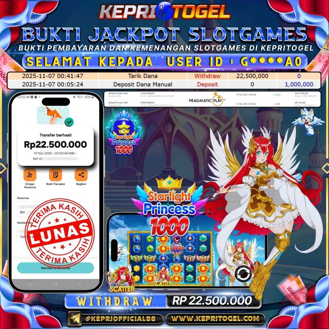Selamat kepada UserId G****A0 telah berhasil mendapatkan kemenangan jackpot pada permainan Slot Starlight Princess 1000 Kepritogel sebesar Rp22,500,000,- . Kepritogel situs terpercaya sejak dulu hingga saat ini , Untuk kemenangan berapapun pasti akan kami bayarkan . Jangan ragu bermain di Kepri Togel . Kami pihak Kepritogel Menyampaikan terima kasih kepada seluruh member Kepri Togel yang telah Percaya dan setia Bersama kami bermain di Kepritogel hingga saat ini.