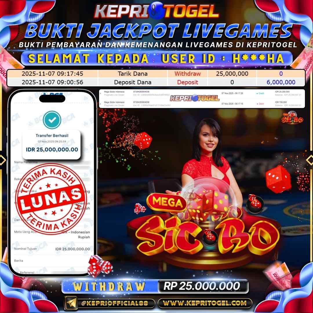 Selamat kepada UserId H***HA telah berhasil mendapatkan kemenangan jackpot pada permainan Live Game Mega Sic Bo Kepritogel sebesar Rp25,000,000,- . Kepritogel situs terpercaya sejak dulu hingga saat ini , Untuk kemenangan berapapun pasti akan kami bayarkan . Jangan ragu bermain di Kepri Togel . Kami pihak Kepritogel Menyampaikan terima kasih kepada seluruh member Kepri Togel yang telah Percaya dan setia Bersama kami bermain di Kepritogel hingga saat ini.