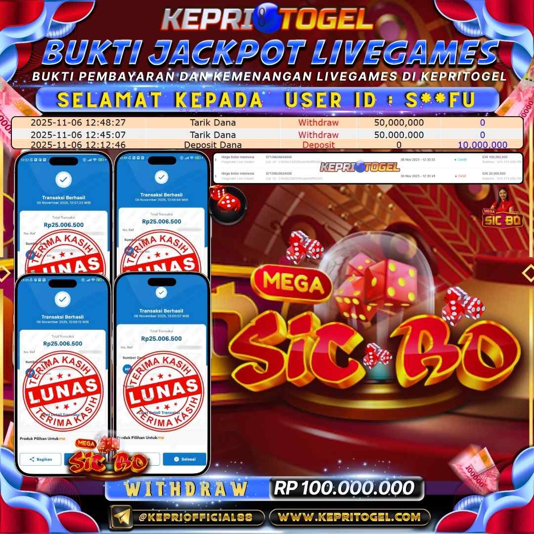 Selamat kepada UserId S**FU telah berhasil mendapatkan kemenangan jackpot pada permainan Live Game Mega Sic Bo Kepritogel sebesar Rp100,000,000,- . Kepritogel situs terpercaya sejak dulu hingga saat ini , Untuk kemenangan berapapun pasti akan kami bayarkan . Jangan ragu bermain di Kepri Togel . Kami pihak Kepritogel Menyampaikan terima kasih kepada seluruh member Kepri Togel yang telah Percaya dan setia Bersama kami bermain di Kepritogel hingga saat ini.