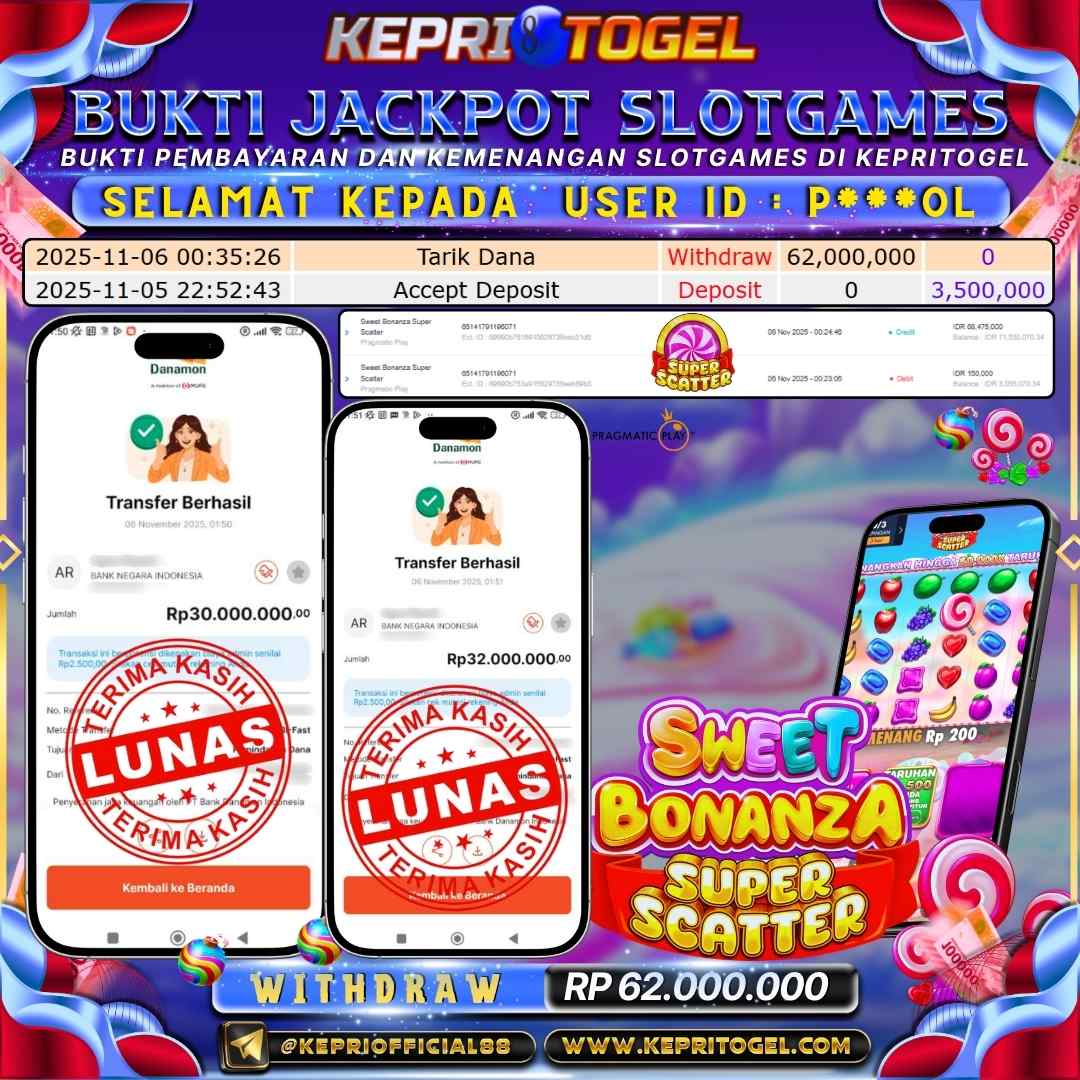 Selamat kepada UserId P***OL telah berhasil mendapatkan kemenangan jackpot pada permainan Slot Sweet Bonanza Super Scatter Kepritogel sebesar Rp62,000,000,- . Kepritogel situs terpercaya sejak dulu hingga saat ini , Untuk kemenangan berapapun pasti akan kami bayarkan . Jangan ragu bermain di Kepri Togel . Kami pihak Kepritogel Menyampaikan terima kasih kepada seluruh member Kepri Togel yang telah Percaya dan setia Bersama kami bermain di Kepritogel hingga saat ini.