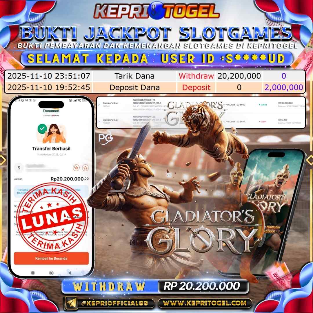 Selamat kepada UserId S****UD telah berhasil mendapatkan kemenangan jackpot pada permainan Slot Gladiator's Glory Kepritogel sebesar Rp20,200,000,- . Kepritogel situs terpercaya sejak dulu hingga saat ini , Untuk kemenangan berapapun pasti akan kami bayarkan . Jangan ragu bermain di Kepri Togel . Kami pihak Kepritogel Menyampaikan terima kasih kepada seluruh member Kepri Togel yang telah Percaya dan setia Bersama kami bermain di Kepritogel hingga saat ini.