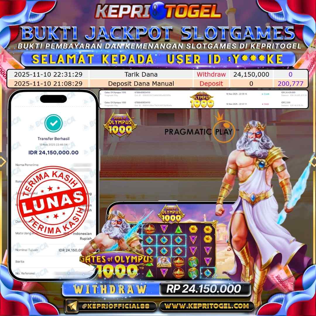Selamat kepada UserId Y***KE telah berhasil mendapatkan kemenangan jackpot pada permainan Slot Gates of Olympus 1000 Kepritogel sebesar Rp24,150,000,- . Kepritogel situs terpercaya sejak dulu hingga saat ini , Untuk kemenangan berapapun pasti akan kami bayarkan . Jangan ragu bermain di Kepri Togel . Kami pihak Kepritogel Menyampaikan terima kasih kepada seluruh member Kepri Togel yang telah Percaya dan setia Bersama kami bermain di Kepritogel hingga saat ini.