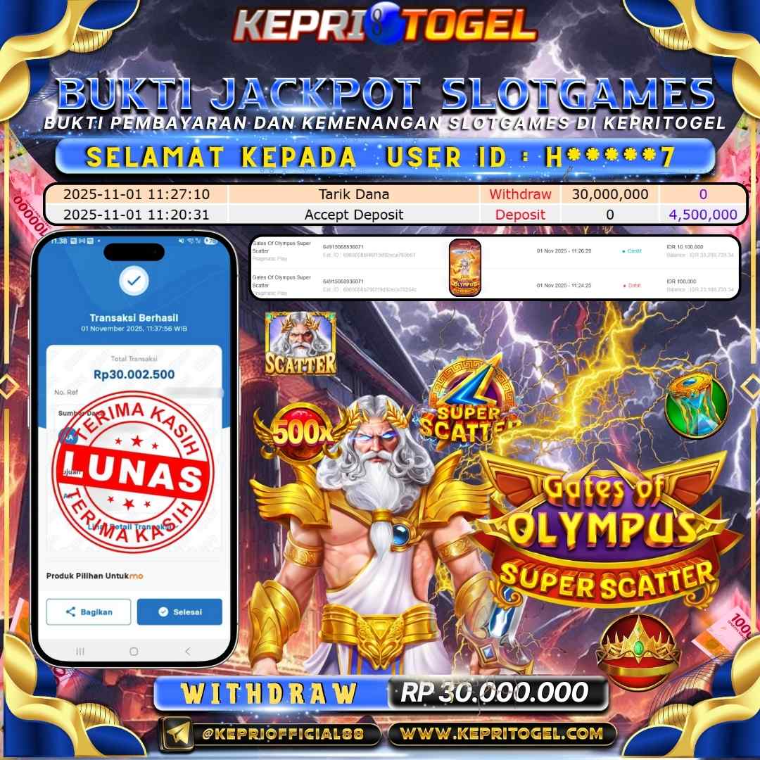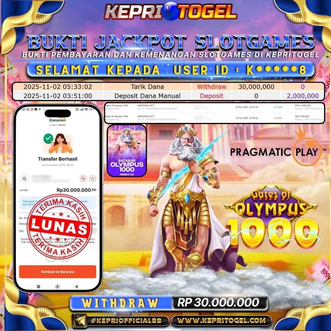Selamat kepada UserId H*****7 telah berhasil mendapatkan kemenangan jackpot pada permainan Slot Gates Of Olympus Super Scater Kepritogel sebesar Rp30,000,000,- . Kepritogel situs terpercaya sejak dulu hingga saat ini , Untuk kemenangan berapapun pasti akan kami bayarkan . Jangan ragu bermain di Kepri Togel . Kami pihak Kepritogel Menyampaikan terima kasih kepada seluruh member Kepri Togel yang telah Percaya dan setia Bersama kami bermain di Kepritogel hingga saat ini.