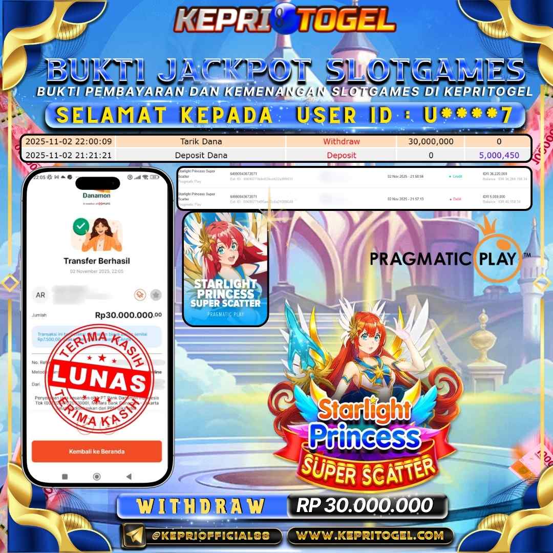 Selamat kepada UserId U****7 telah berhasil mendapatkan kemenangan jackpot pada permainan Slot Starlight Princess Super Scater Kepritogel sebesar Rp30,000,000,- . Kepritogel situs terpercaya sejak dulu hingga saat ini , Untuk kemenangan berapapun pasti akan kami bayarkan . Jangan ragu bermain di Kepri Togel . Kami pihak Kepritogel Menyampaikan terima kasih kepada seluruh member Kepri Togel yang telah Percaya dan setia Bersama kami bermain di Kepritogel hingga saat ini.