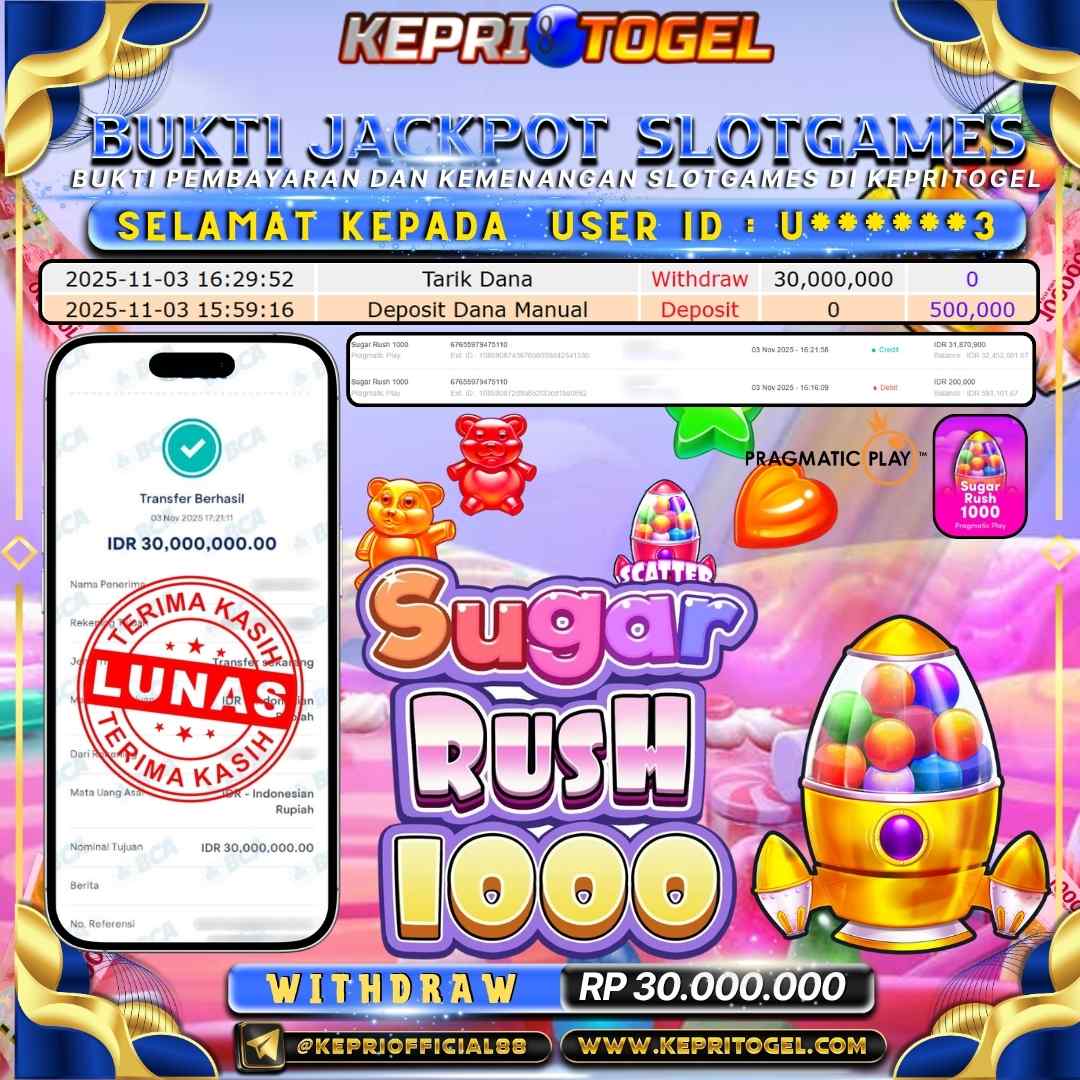 Selamat kepada UserId U******3 telah berhasil mendapatkan kemenangan jackpot pada permainan Slot Sugar Rush 1000 Kepritogel sebesar Rp30,000,000,- . Kepritogel situs terpercaya sejak dulu hingga saat ini , Untuk kemenangan berapapun pasti akan kami bayarkan . Jangan ragu bermain di Kepri Togel . Kami pihak Kepritogel Menyampaikan terima kasih kepada seluruh member Kepri Togel yang telah Percaya dan setia Bersama kami bermain di Kepritogel hingga saat ini.