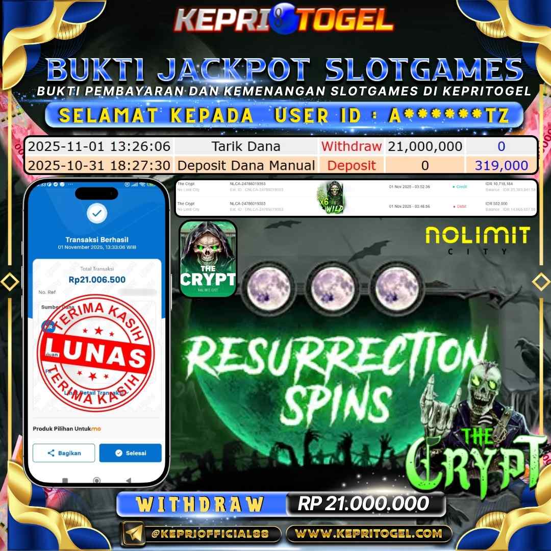 Selamat kepada UserId a******TZ telah berhasil mendapatkan kemenangan jackpot pada permainan Slot The Crypt Kepritogel sebesar Rp21,000,000,- . Kepritogel situs terpercaya sejak dulu hingga saat ini , Untuk kemenangan berapapun pasti akan kami bayarkan . Jangan ragu bermain di Kepri Togel . Kami pihak Kepritogel Menyampaikan terima kasih kepada seluruh member Kepri Togel yang telah Percaya dan setia Bersama kami bermain di Kepritogel hingga saat ini.