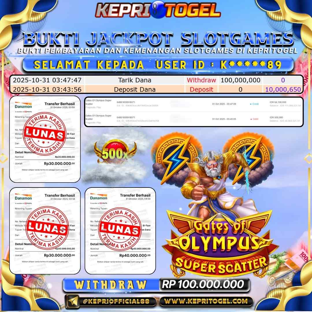Selamat kepada UserId K*****89 telah berhasil mendapatkan kemenangan jackpot pada permainan Slot Gates Of Olympus Super Scater Kepritogel sebesar Rp100,000,000,- . Kepritogel situs terpercaya sejak dulu hingga saat ini , Untuk kemenangan berapapun pasti akan kami bayarkan . Jangan ragu bermain di Kepri Togel . Kami pihak Kepritogel Menyampaikan terima kasih kepada seluruh member Kepri Togel yang telah Percaya dan setia Bersama kami bermain di Kepritogel hingga saat ini.