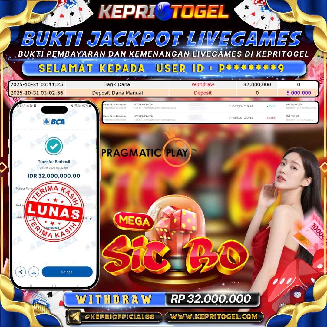 Selamat kepada UserId P*******9 telah berhasil mendapatkan kemenangan jackpot pada permainan Live Game Mega Sicbo Kepritogel sebesar Rp32,000,000,- . Kepritogel situs terpercaya sejak dulu hingga saat ini , Untuk kemenangan berapapun pasti akan kami bayarkan . Jangan ragu bermain di Kepri Togel . Kami pihak Kepritogel Menyampaikan terima kasih kepada seluruh member Kepri Togel yang telah Percaya dan setia Bersama kami bermain di Kepritogel hingga saat ini.
