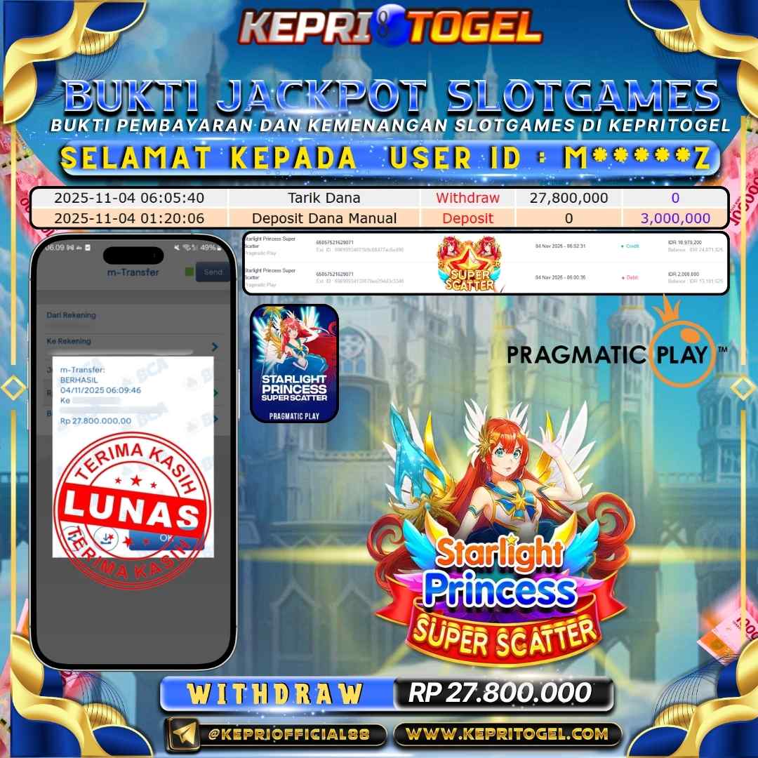 Selamat kepada UserId M*****Z telah berhasil mendapatkan kemenangan jackpot pada permainan Slot Starlight Princess Super Scater Kepritogel sebesar Rp27,800,000,- . Kepritogel situs terpercaya sejak dulu hingga saat ini , Untuk kemenangan berapapun pasti akan kami bayarkan . Jangan ragu bermain di Kepri Togel . Kami pihak Kepritogel Menyampaikan terima kasih kepada seluruh member Kepri Togel yang telah Percaya dan setia Bersama kami bermain di Kepritogel hingga saat ini.