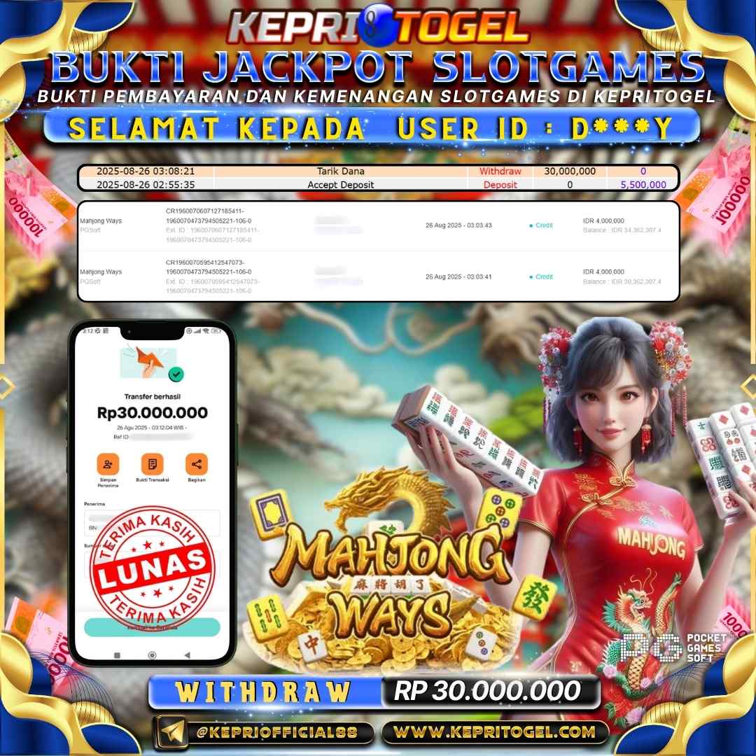 Selamat kepada UserId D***y telah berhasil mendapatkan kemenangan jackpot pada permainan Slot Mahjong Ways Kepritogel sebesar Rp30,000,000,- . Kepritogel situs terpercaya sejak dulu hingga saat ini , Untuk kemenangan berapapun pasti akan kami bayarkan . Jangan ragu bermain di Kepri Togel . Kami pihak Kepritogel Menyampaikan terima kasih kepada seluruh member Kepri Togel yang telah Percaya dan setia Bersama kami bermain di Kepritogel hingga saat ini.