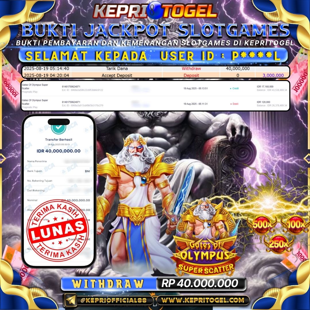 Selamat kepada UserId P****L telah berhasil mendapatkan kemenangan jackpot pada permainan Slot Gates Of Olympus Super Scatter Kepritogel sebesar Rp40,000,000,-. Kepritogel situs terpercaya sejak dulu hingga saat ini , Untuk kemenangan berapapun pasti akan kami bayarkan . Jangan ragu bermain di Kepri Togel . Kami pihak Kepritogel Menyampaikan terima kasih kepada seluruh member Kepri Togel yang telah Percaya dan setia Bersama kami bermain di Kepritogel hingga saat ini.