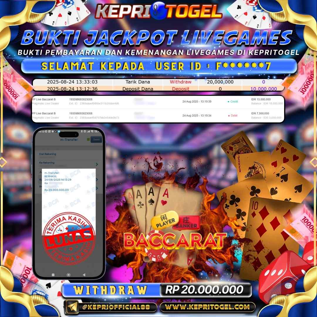 Selamat kepada UserId F******7 telah berhasil mendapatkan kemenangan jackpot pada permainan Live Game PP Live Baccarat B Kepritogel sebesar Rp20,000,000,- . Kepritogel situs terpercaya sejak dulu hingga saat ini , Untuk kemenangan berapapun pasti akan kami bayarkan . Jangan ragu bermain di Kepri Togel . Kami pihak Kepritogel Menyampaikan terima kasih kepada seluruh member Kepri Togel yang telah Percaya dan setia Bersama kami bermain di Kepritogel hingga saat ini.
