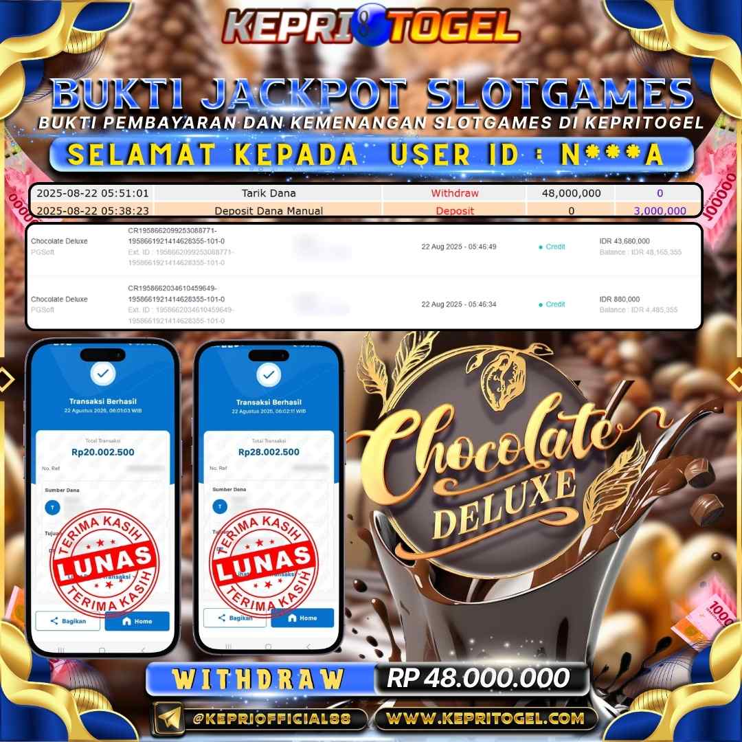 Selamat kepada UserId N***A telah berhasil mendapatkan kemenangan jackpot pada permainan Slot Chocolate Deluxe Kepritogel sebesar Rp48,000,000,- . Kepritogel situs terpercaya sejak dulu hingga saat ini , Untuk kemenangan berapapun pasti akan kami bayarkan . Jangan ragu bermain di Kepri Togel . Kami pihak Kepritogel Menyampaikan terima kasih kepada seluruh member Kepri Togel yang telah Percaya dan setia Bersama kami bermain di Kepritogel hingga saat ini.