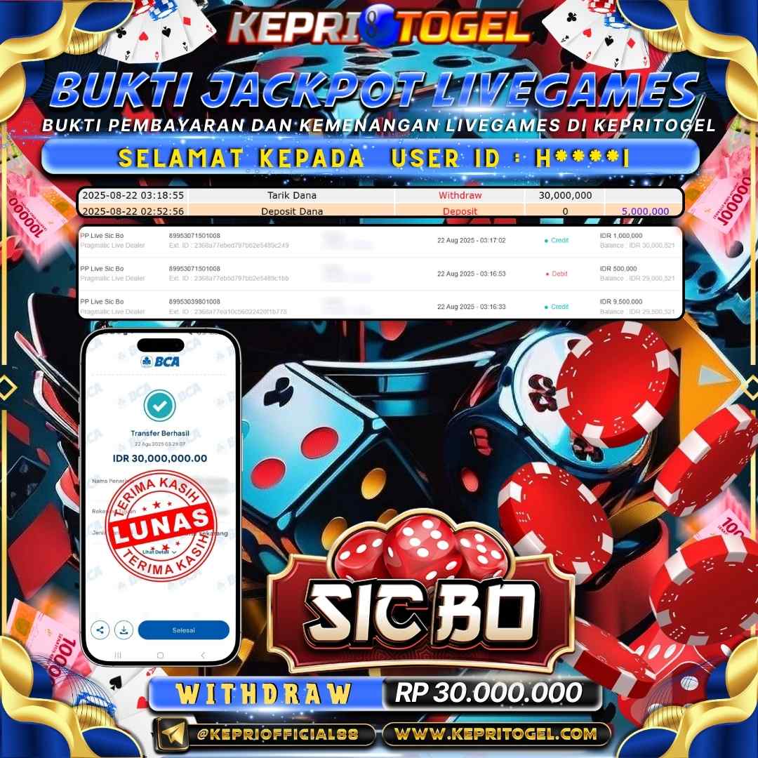 Selamat kepada UserId H****I telah berhasil mendapatkan kemenangan jackpot pada permainan Live Game Sicbo Kepritogel sebesar Rp30,000,000,- . Kepritogel situs terpercaya sejak dulu hingga saat ini , Untuk kemenangan berapapun pasti akan kami bayarkan . Jangan ragu bermain di Kepri Togel . Kami pihak Kepritogel Menyampaikan terima kasih kepada seluruh member Kepri Togel yang telah Percaya dan setia Bersama kami bermain di Kepritogel hingga saat ini.
