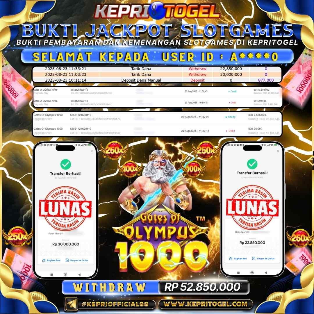 Selamat kepada UserId A****0 telah berhasil mendapatkan kemenangan jackpot pada permainan Slot Gates of Olympus 1000 Kepritogel sebesar Rp52,850,000,-. Kepritogel situs terpercaya sejak dulu hingga saat ini , Untuk kemenangan berapapun pasti akan kami bayarkan . Jangan ragu bermain di Kepri Togel . Kami pihak Kepritogel Menyampaikan terima kasih kepada seluruh member Kepri Togel yang telah Percaya dan setia Bersama kami bermain di Kepritogel hingga saat ini.