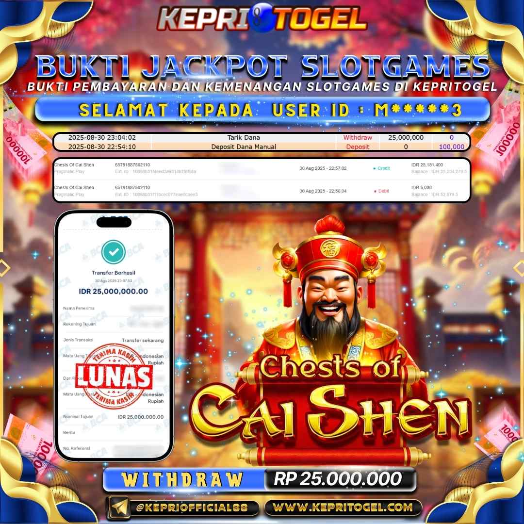 Selamat kepada UserId M*****3 telah berhasil mendapatkan kemenangan jackpot pada permainan Slot Chests Of Cai Shen Kepritogel sebesar Rp25,000,000,-. Kepritogel situs terpercaya sejak dulu hingga saat ini , Untuk kemenangan berapapun pasti akan kami bayarkan . Jangan ragu bermain di Kepri Togel . Kami pihak Kepritogel Menyampaikan terima kasih kepada seluruh member Kepri Togel yang telah Percaya dan setia Bersama kami bermain di Kepritogel hingga saat ini.