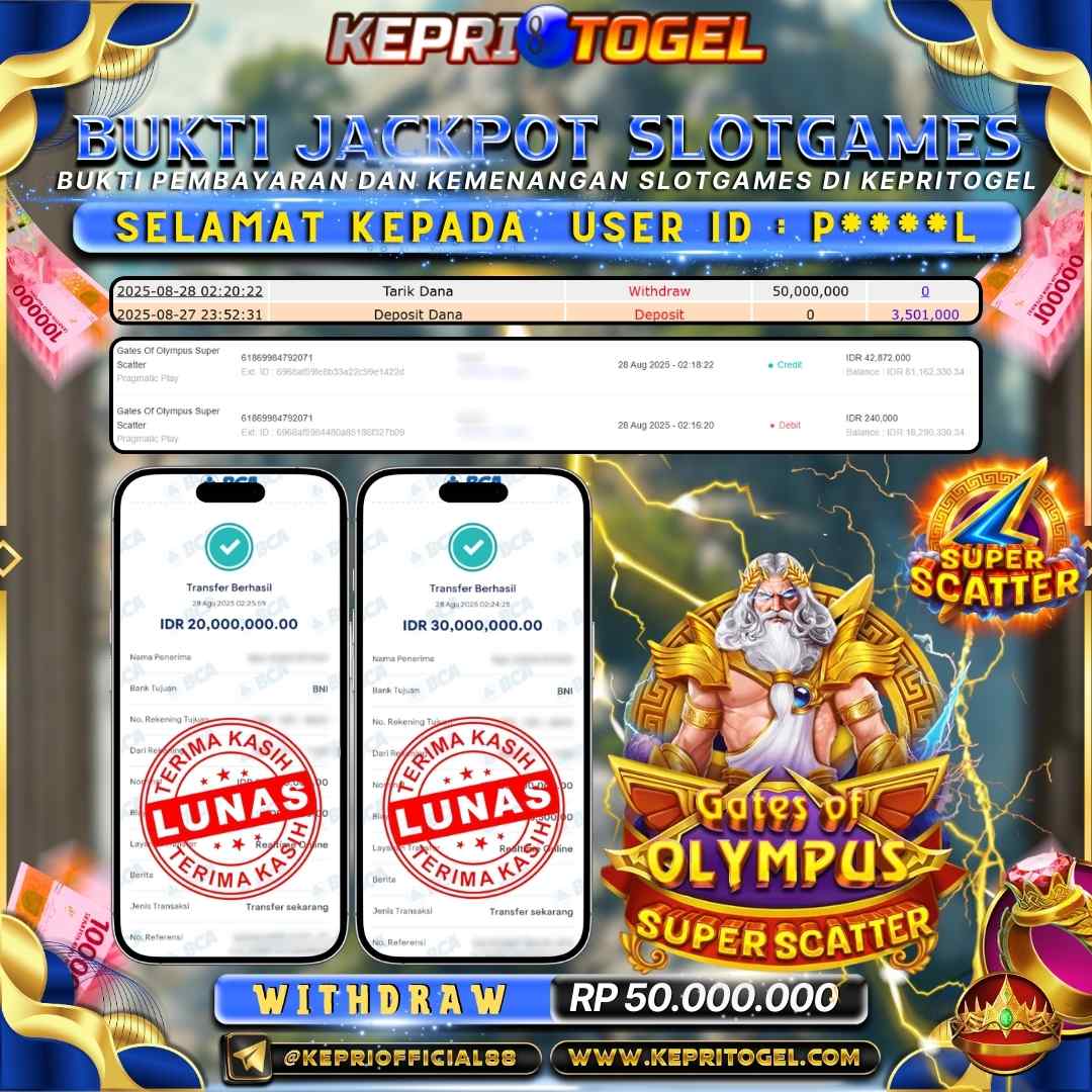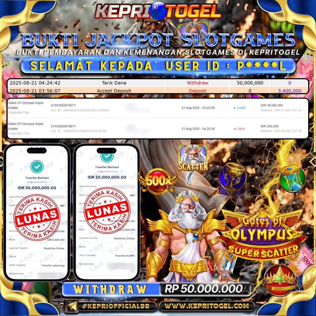 Selamat kepada UserId P***OL telah berhasil mendapatkan kemenangan jackpot pada permainan Slot Gates Of Olympus Super Scatter Kepritogel sebesar Rp50,000,000,-. Kepritogel situs terpercaya sejak dulu hingga saat ini , Untuk kemenangan berapapun pasti akan kami bayarkan . Jangan ragu bermain di Kepri Togel . Kami pihak Kepritogel Menyampaikan terima kasih kepada seluruh member Kepri Togel yang telah Percaya dan setia Bersama kami bermain di Kepritogel hingga saat ini.