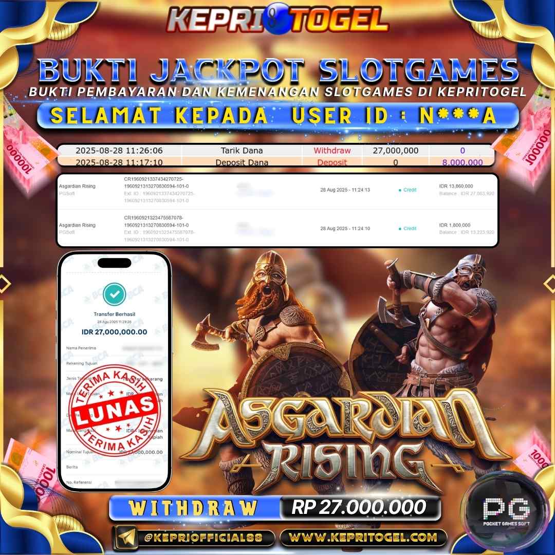Selamat kepada UserId N***a telah berhasil mendapatkan kemenangan jackpot pada permainan Slot Asgardian Rising Kepritogel sebesar Rp27,000,000,- . Kepritogel situs terpercaya sejak dulu hingga saat ini , Untuk kemenangan berapapun pasti akan kami bayarkan . Jangan ragu bermain di Kepri Togel . Kami pihak Kepritogel Menyampaikan terima kasih kepada seluruh member Kepri Togel yang telah Percaya dan setia Bersama kami bermain di Kepritogel hingga saat ini.