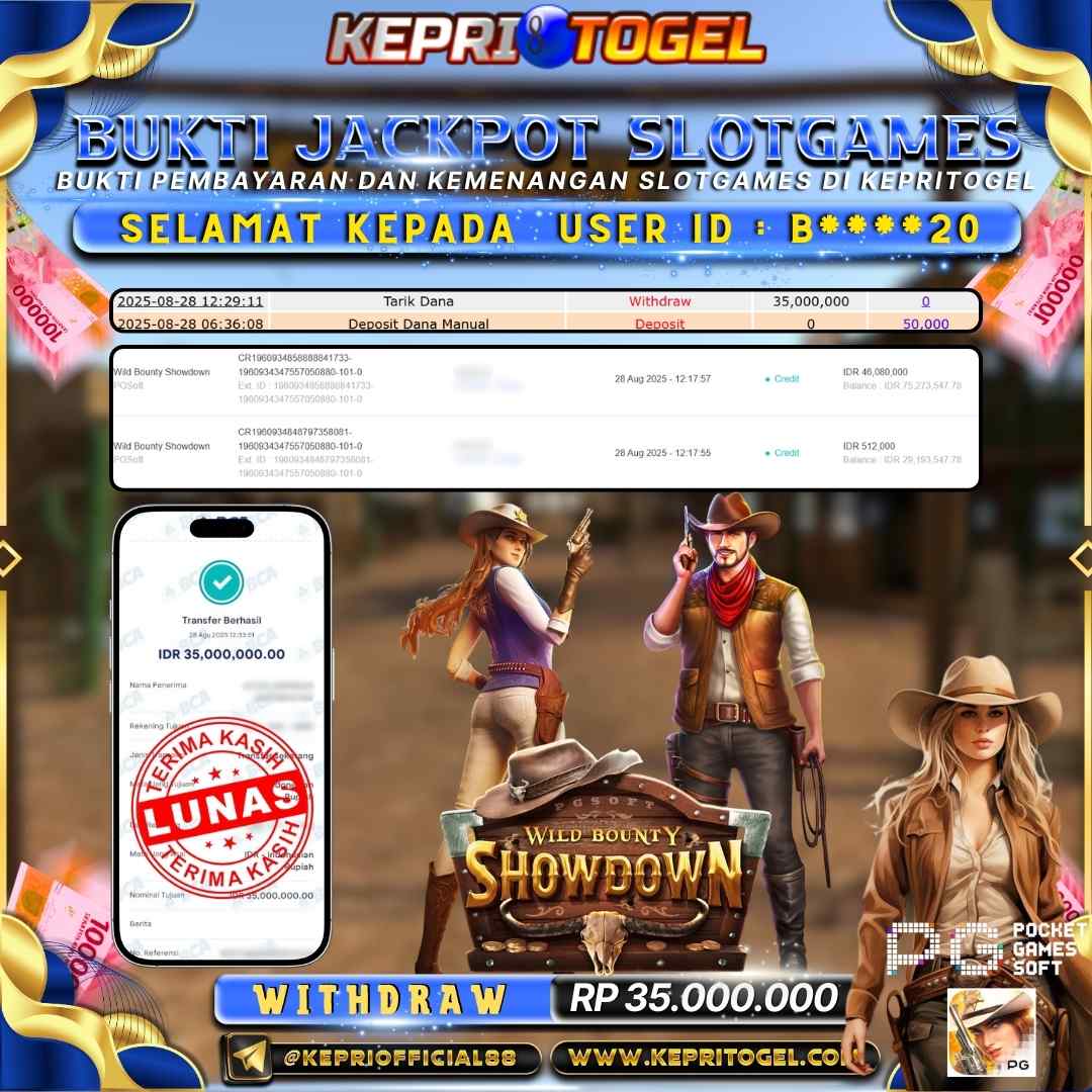 Selamat kepada UserId B****20 telah berhasil mendapatkan kemenangan jackpot pada permainan Slot Wild Bounty Showdown Kepritogel sebesar Rp35,000,000,- . Kepritogel situs terpercaya sejak dulu hingga saat ini , Untuk kemenangan berapapun pasti akan kami bayarkan . Jangan ragu bermain di Kepri Togel . Kami pihak Kepritogel Menyampaikan terima kasih kepada seluruh member Kepri Togel yang telah Percaya dan setia Bersama kami bermain di Kepritogel hingga saat ini.