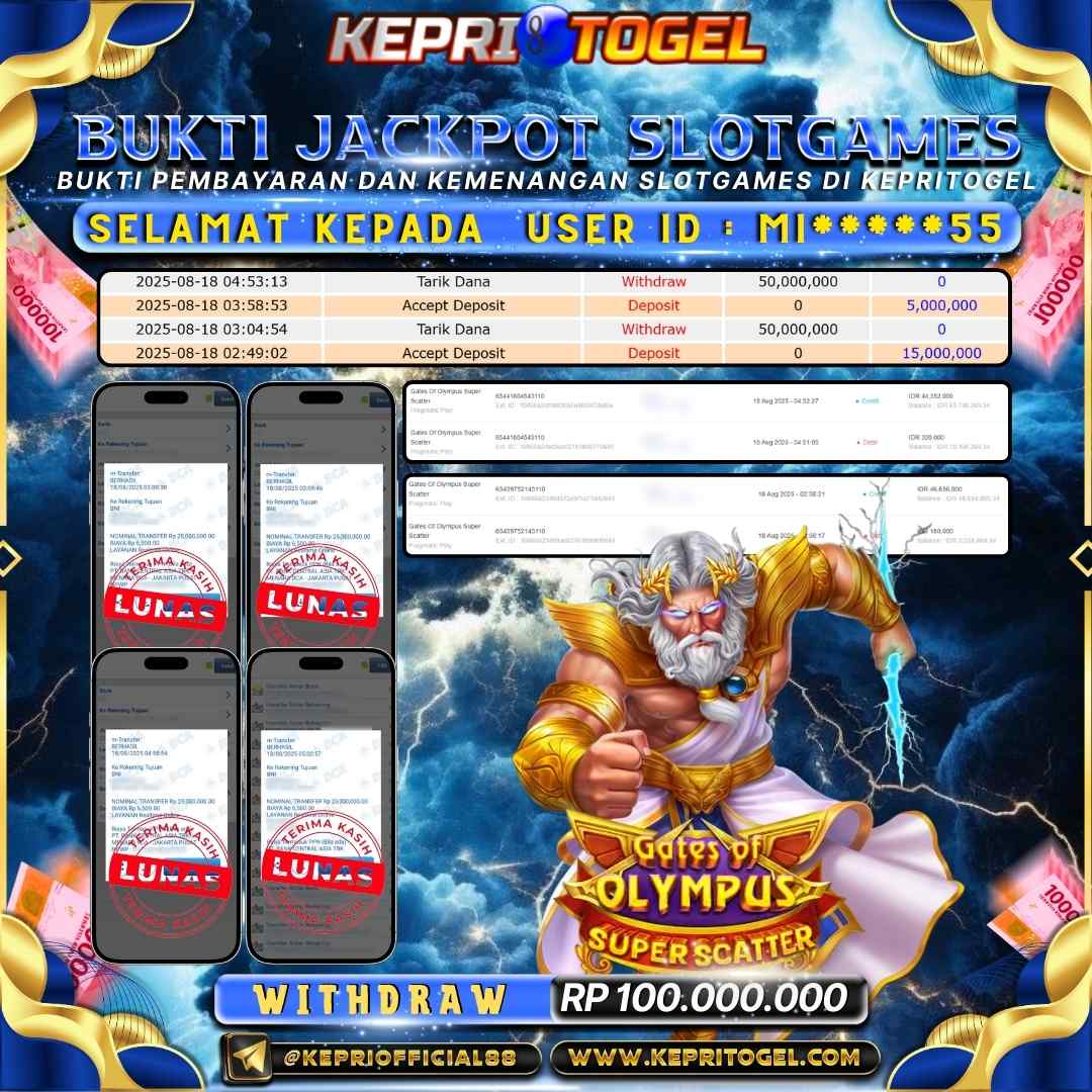 Selamat kepada UserId MI*****55 telah berhasil mendapatkan kemenangan jackpot pada permainan Slot Gates Of Olympus Super Scatter Kepritogel sebesar Rp100,000,000,-. Kepritogel situs terpercaya sejak dulu hingga saat ini , Untuk kemenangan berapapun pasti akan kami bayarkan . Jangan ragu bermain di Kepri Togel . Kami pihak Kepritogel Menyampaikan terima kasih kepada seluruh member Kepri Togel yang telah Percaya dan setia Bersama kami bermain di Kepritogel hingga saat ini.