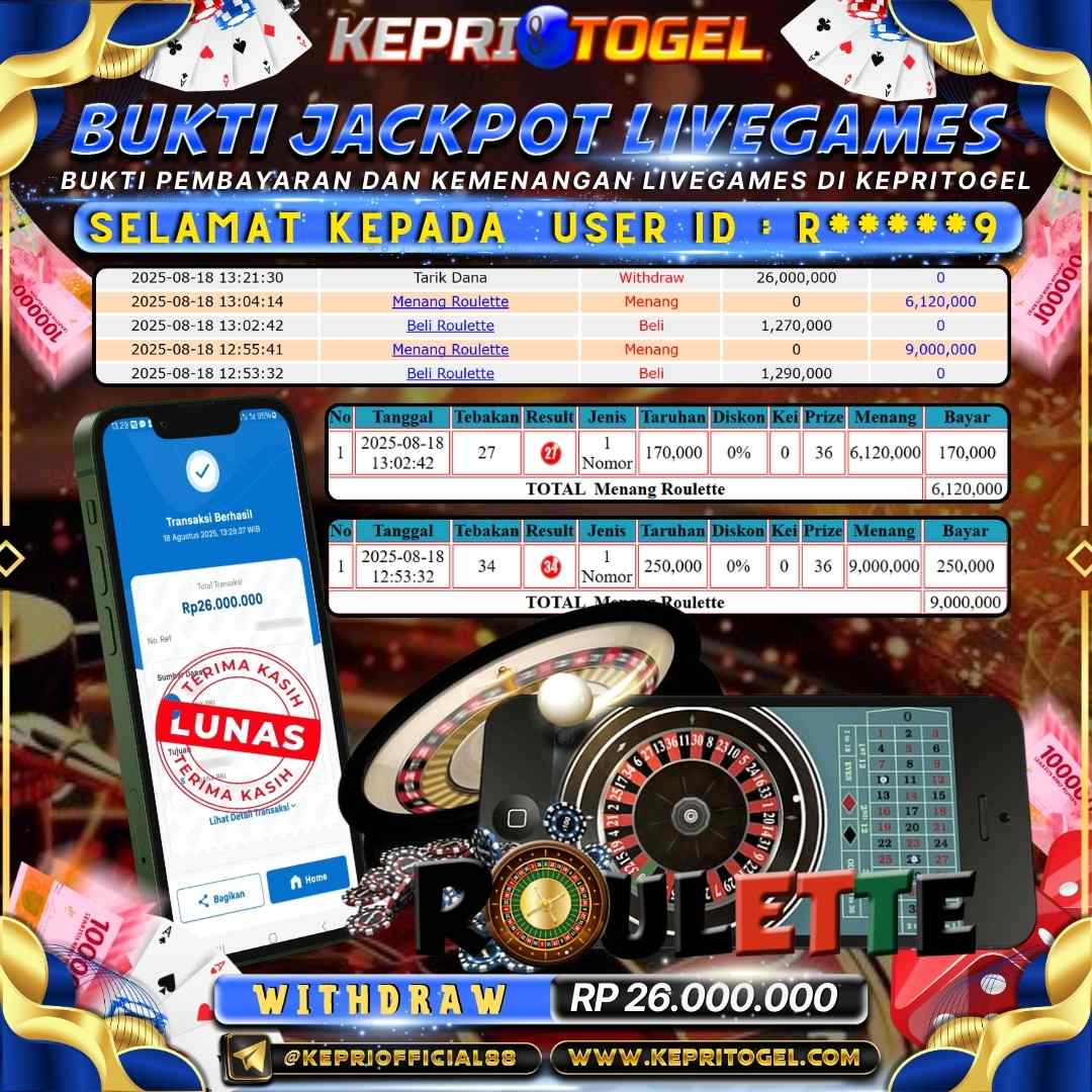 Selamat kepada UserId R*****9 telah berhasil mendapatkan kemenangan jackpot pada permainan Live Game Roulette Kepritogel sebesar Rp26,000,000,- . Kepritogel situs terpercaya sejak dulu hingga saat ini , Untuk kemenangan berapapun pasti akan kami bayarkan . Jangan ragu bermain di Kepri Togel . Kami pihak Kepritogel Menyampaikan terima kasih kepada seluruh member Kepri Togel yang telah Percaya dan setia Bersama kami bermain di Kepritogel hingga saat ini.