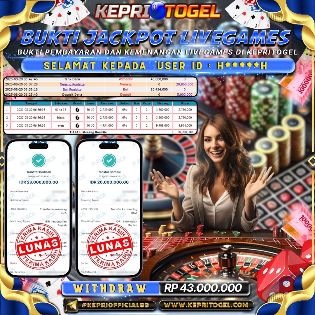 Selamat kepada UserId H*****H telah berhasil mendapatkan kemenangan jackpot pada permainan Live Game Roulette Kepritogel sebesar Rp43,000,000,- . Kepritogel situs terpercaya sejak dulu hingga saat ini , Untuk kemenangan berapapun pasti akan kami bayarkan . Jangan ragu bermain di Kepri Togel . Kami pihak Kepritogel Menyampaikan terima kasih kepada seluruh member Kepri Togel yang telah Percaya dan setia Bersama kami bermain di Kepritogel hingga saat ini.