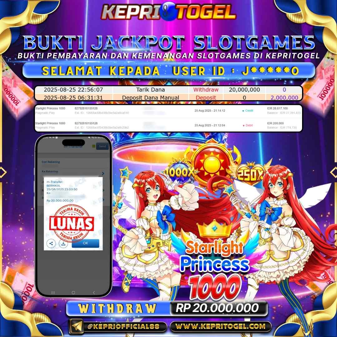 Selamat kepada UserId J*****O* telah berhasil mendapatkan kemenangan jackpot pada permainan Slot Starlight Princess 1000 Kepritogel sebesar Rp20,000,000,-. Kepritogel situs terpercaya sejak dulu hingga saat ini , Untuk kemenangan berapapun pasti akan kami bayarkan . Jangan ragu bermain di Kepri Togel . Kami pihak Kepritogel Menyampaikan terima kasih kepada seluruh member Kepri Togel yang telah Percaya dan setia Bersama kami bermain di Kepritogel hingga saat ini.