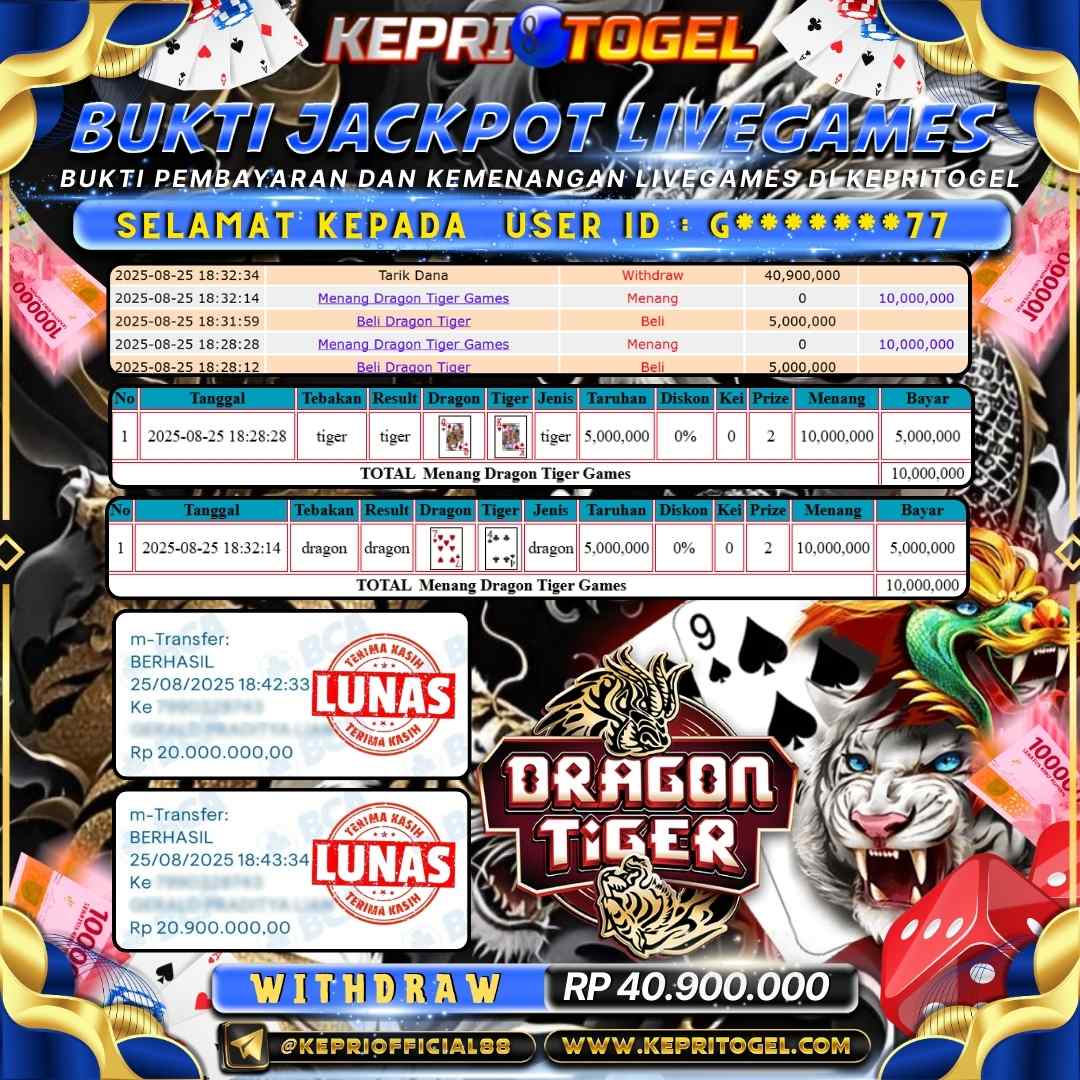 Kepritogel Jackpot Live Game Dragon & Tiger Rp40,900,000