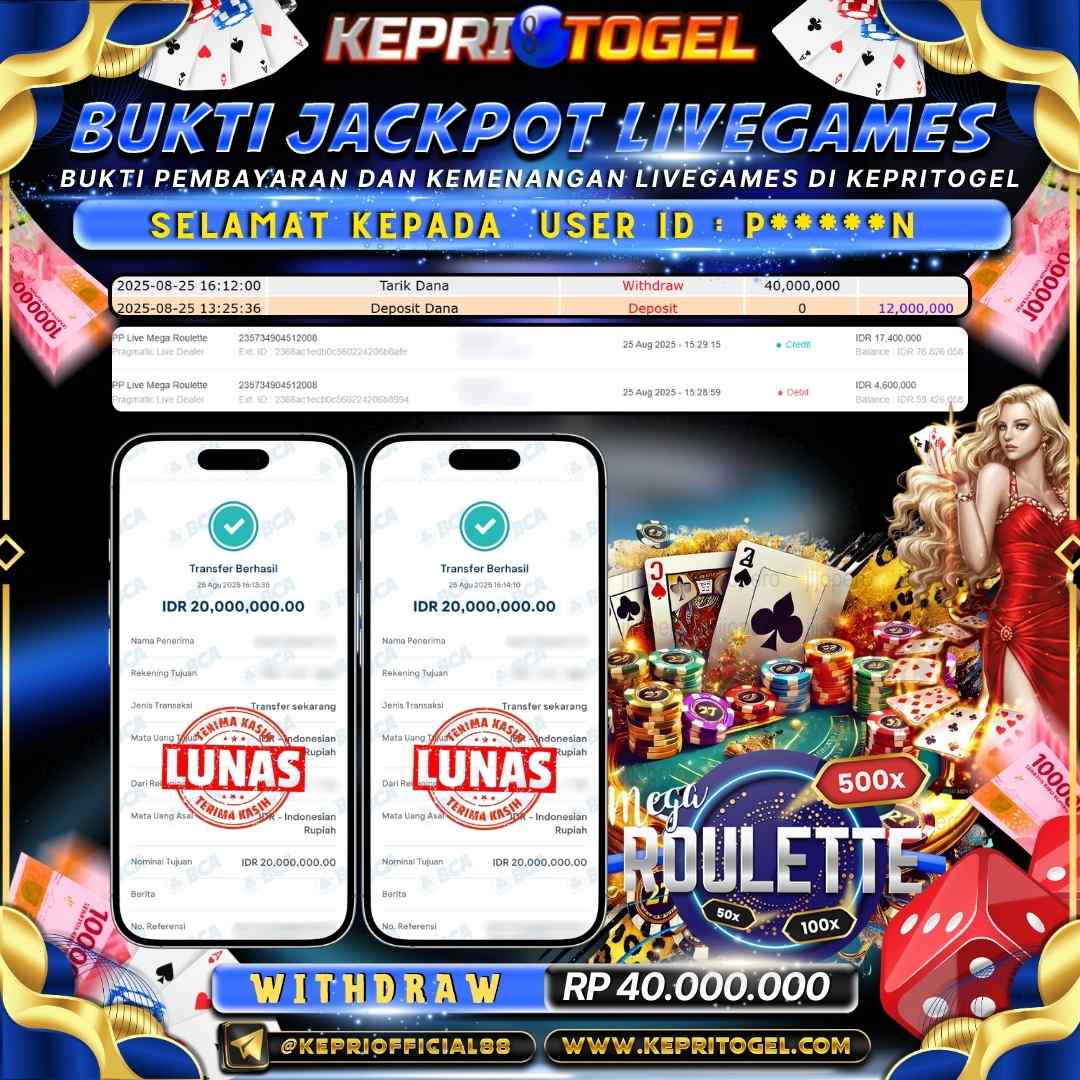 Selamat kepada UserId P*****N telah berhasil mendapatkan kemenangan jackpot pada permainan Live Game PP Live Mega Roulette Kepritogel sebesar Rp40,000,000,- . Kepritogel situs terpercaya sejak dulu hingga saat ini , Untuk kemenangan berapapun pasti akan kami bayarkan . Jangan ragu bermain di Kepri Togel . Kami pihak Kepritogel Menyampaikan terima kasih kepada seluruh member Kepri Togel yang telah Percaya dan setia Bersama kami bermain di Kepritogel hingga saat ini.